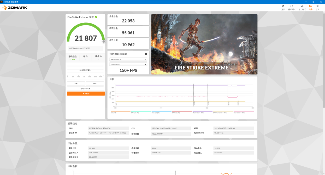 在3DMarkFireStrikeDX11测试中,由于传统的FireStrike已经无法满足高端显卡的需要,因此我们只测试了压力更大的FireStrikeExtreme,七彩虹iGameGeForceRTX4070UltraWV2显卡分数达到了22053分,同样与RTX308012G相近,而功耗却小了一大截。