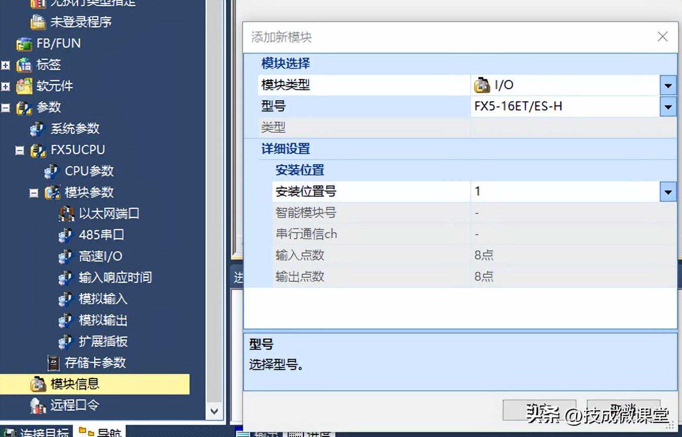 03右击模块信息,点添加新模块,模块类型选I/O,型号选FX5-16ET/ES-H,确定