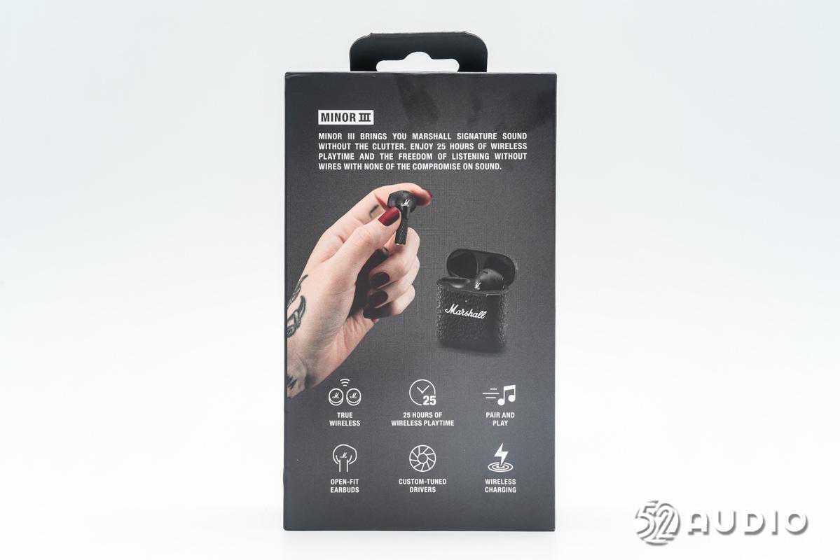 包装盒背面详细介绍了产品功能特点:Marshall标志性调音,25小时续航,配对并播放,开放式耳塞,定制调谐驱动单元,无线充电。