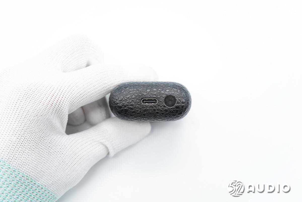 充电盒底部设置CD纹理的蓝牙配对功能按键和Type-C充电接口。