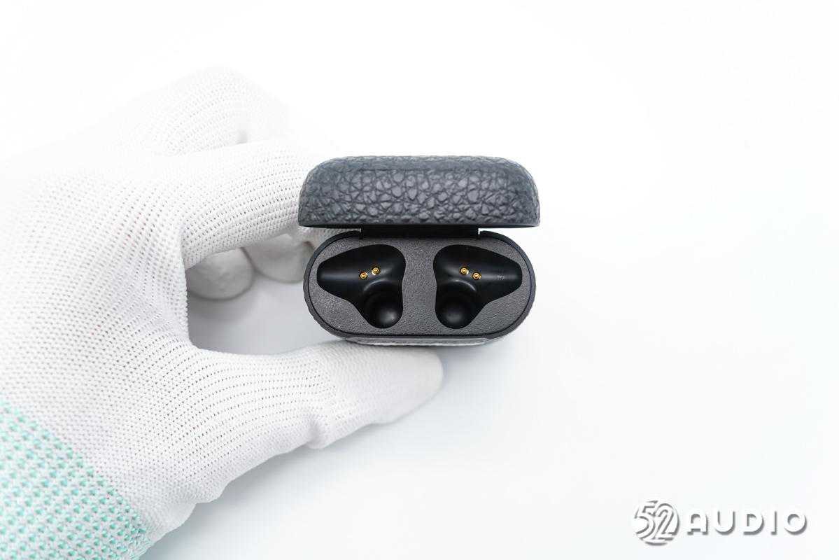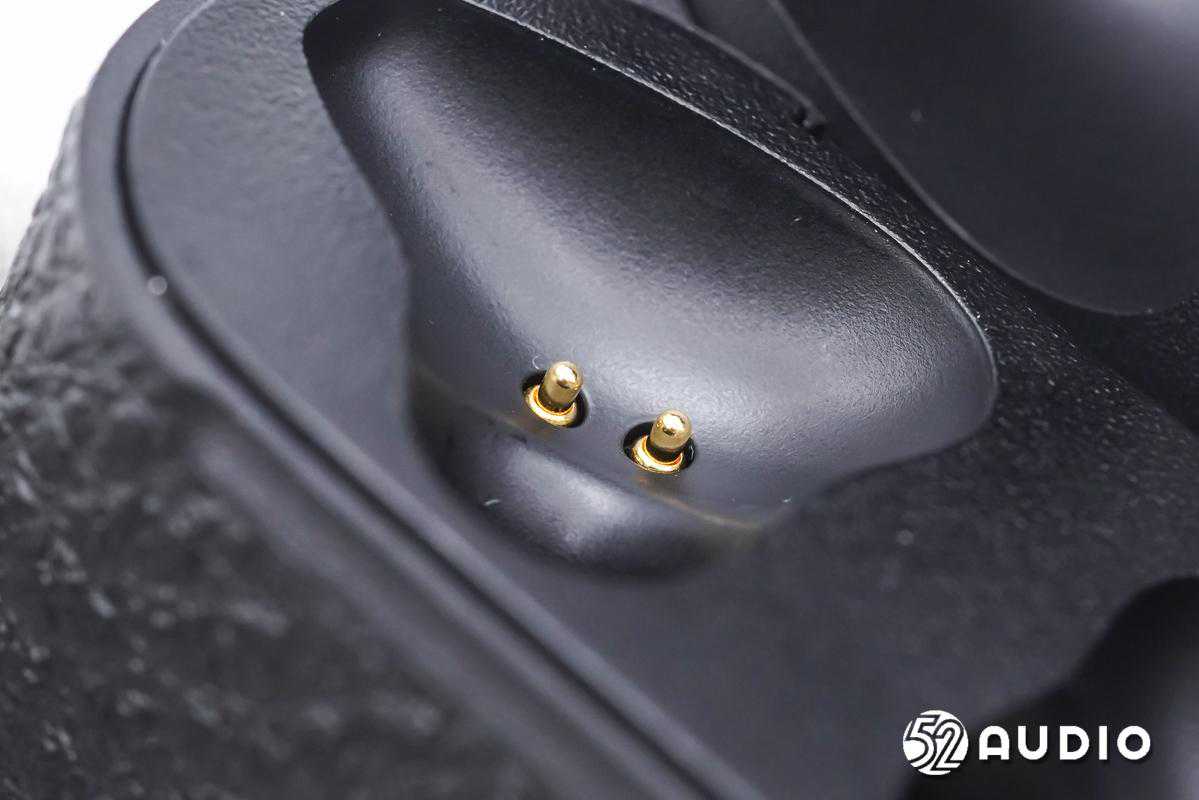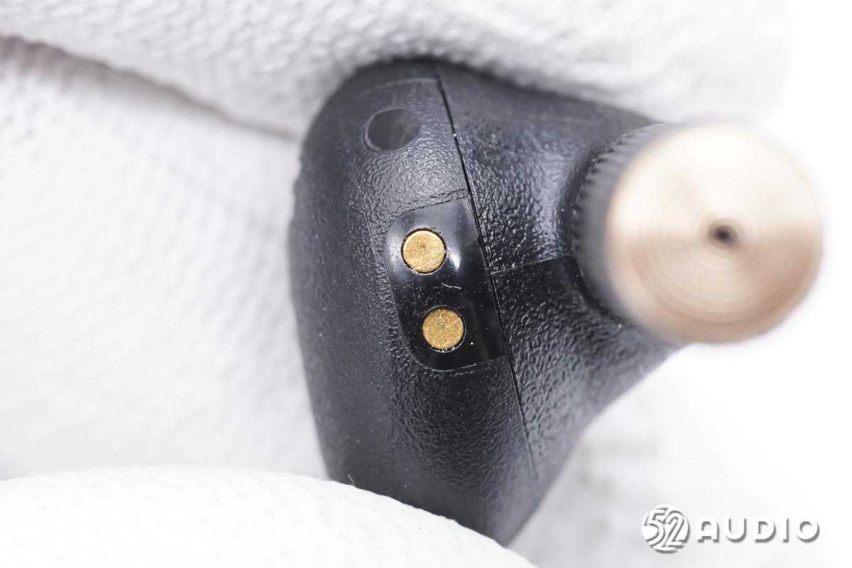 耳机底部两颗金属触点特写,用于为耳机充电。