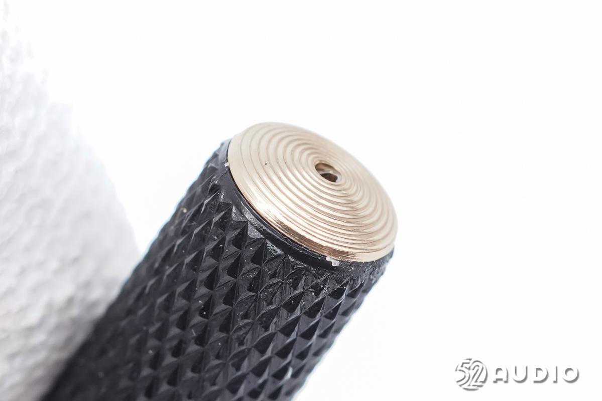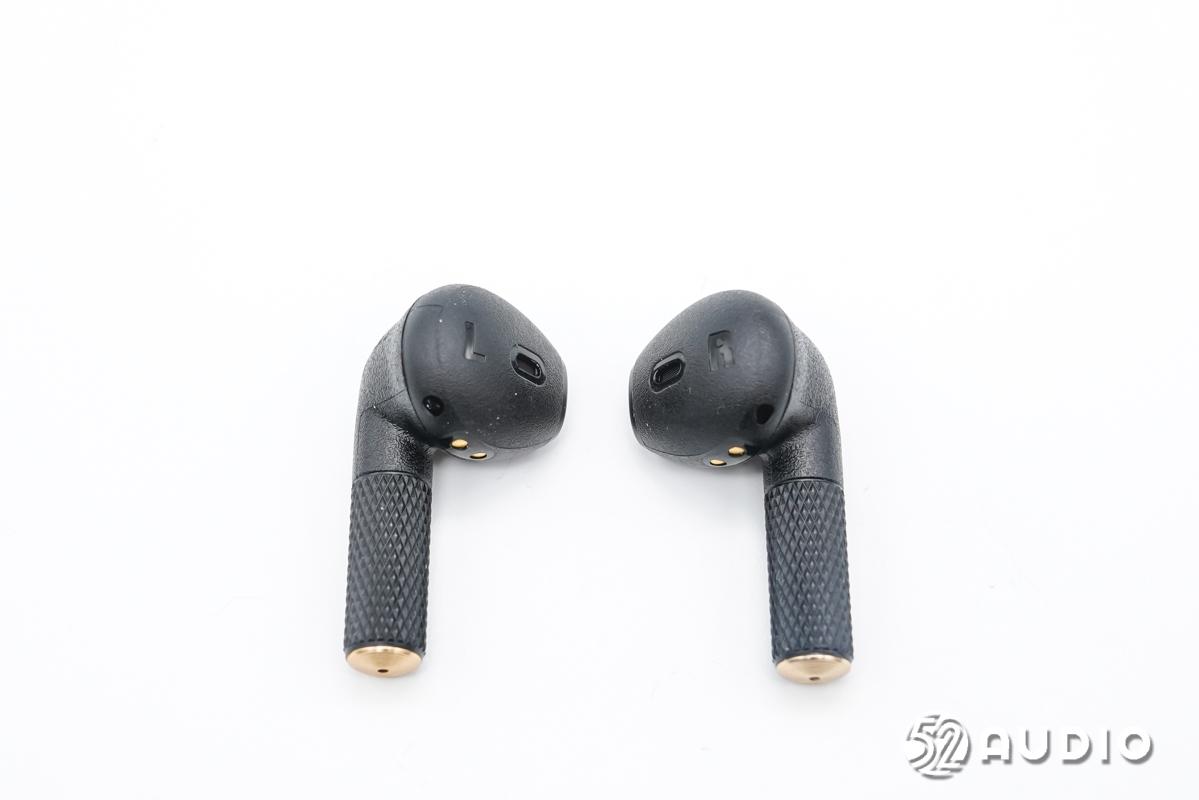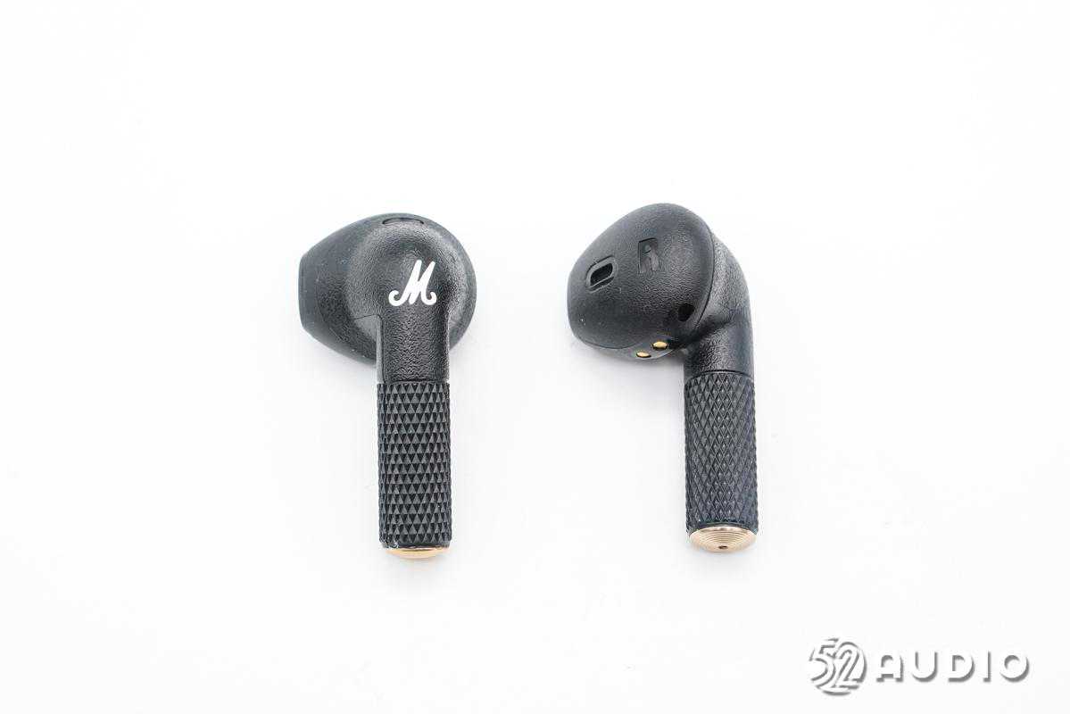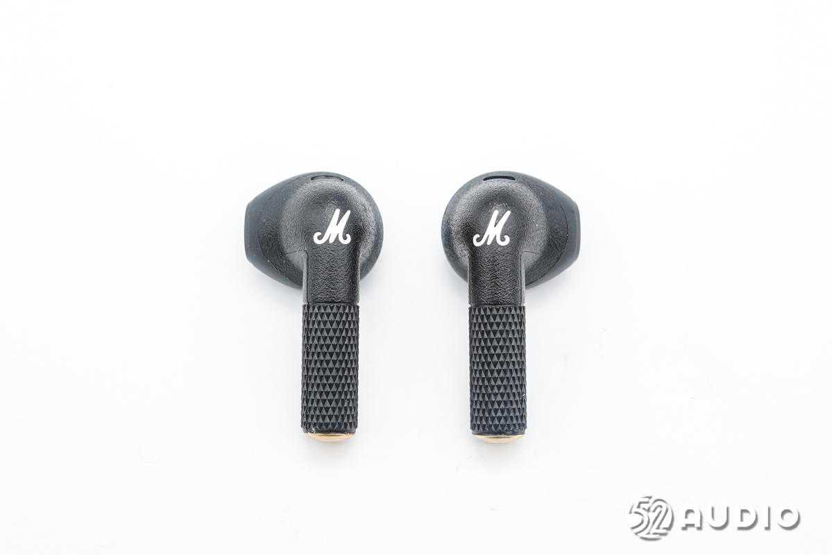 耳机柄背部沉雕马歇尔“M”品牌LOGO,同时也是触控区域。耳机柄下半部分采用菱形点阵,底部设计金色尾塞。