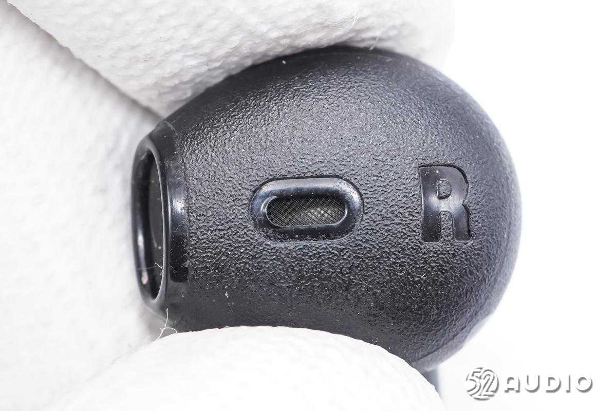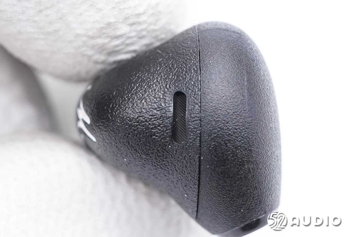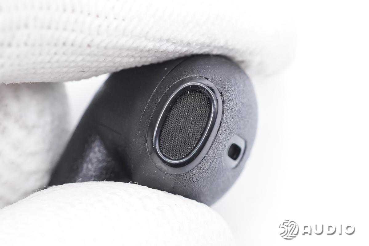 耳机椭圆形出音嘴特写,细密防尘网防护。
