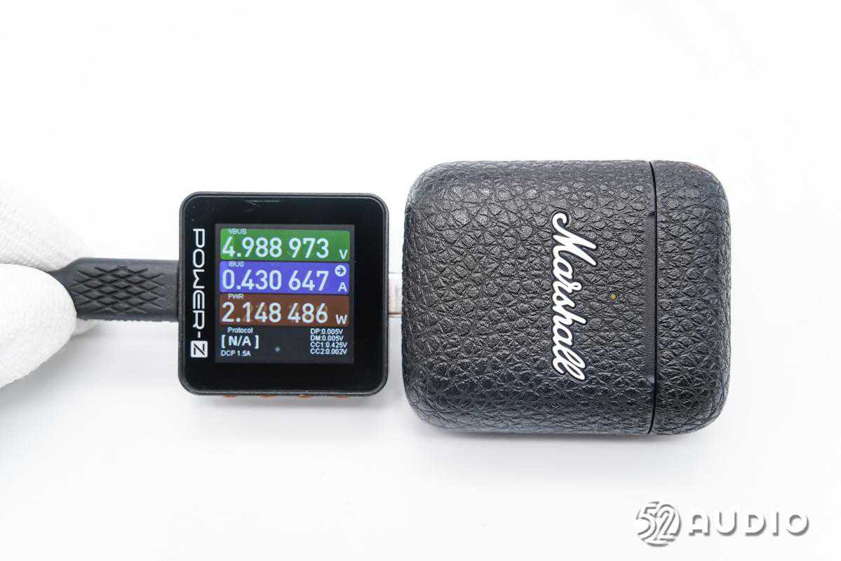 我爱音频网采用CHARGERLABPOWER-ZKM002C对MarshallMINORⅢ真无线耳机进行充电测试,输入功率约为2.15W。