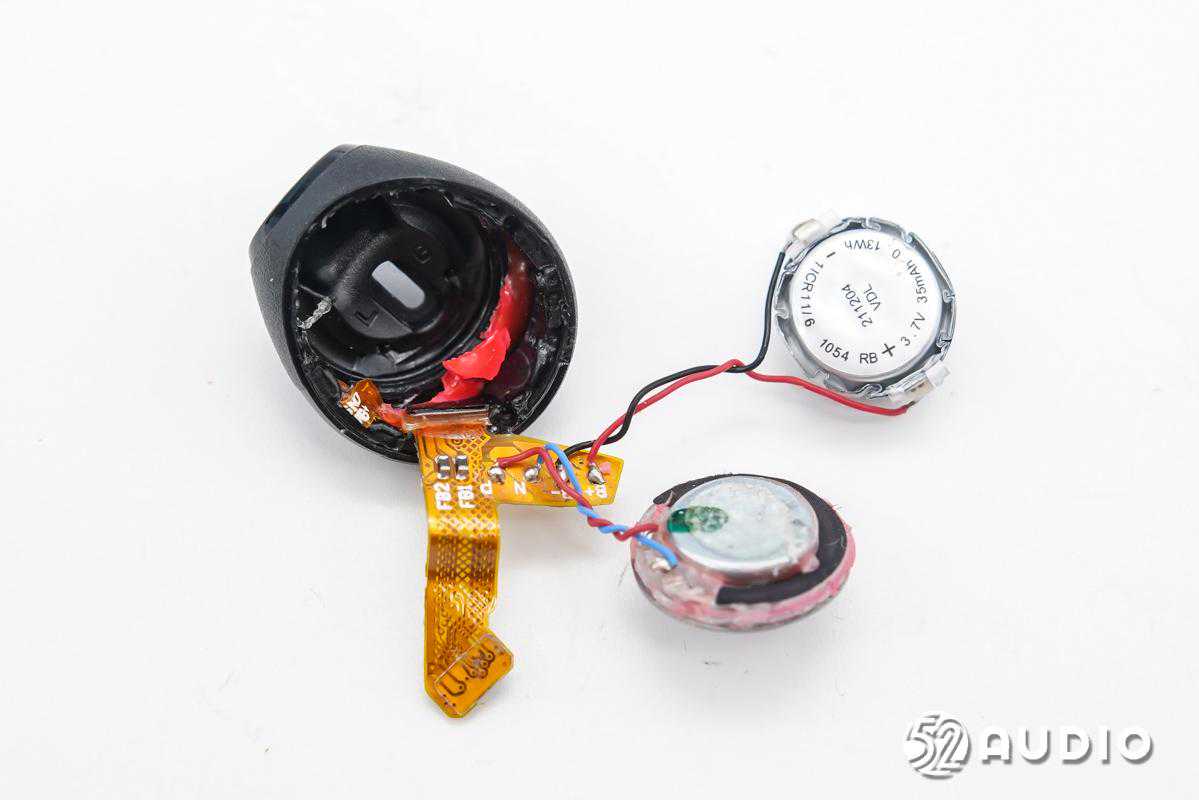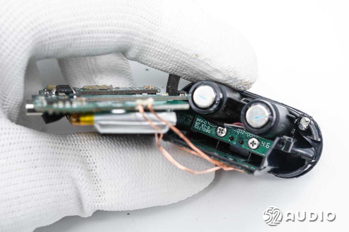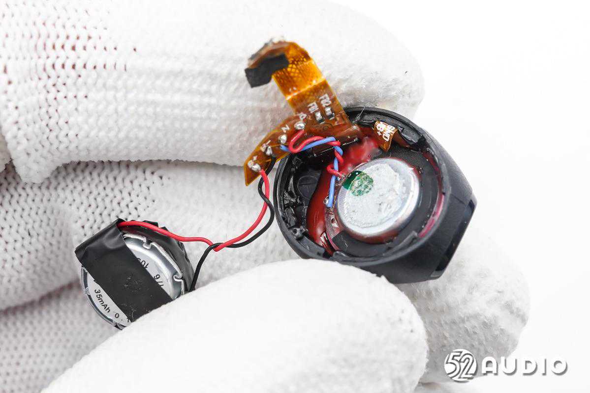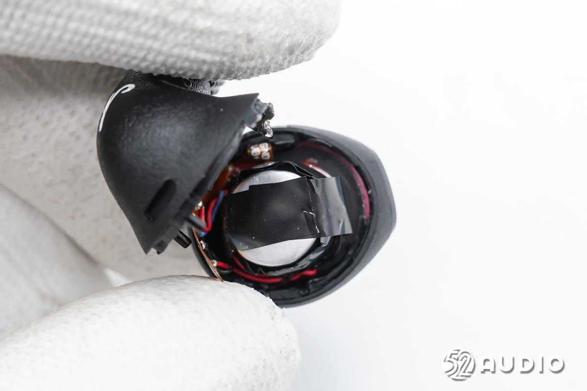 前腔内部结构一览,电池单元固定在扬声器背部,有黑色胶带包裹。