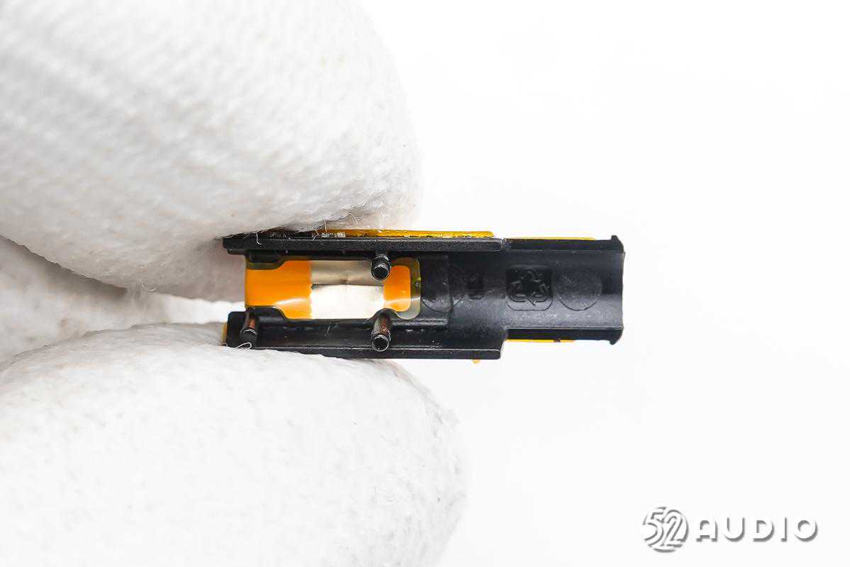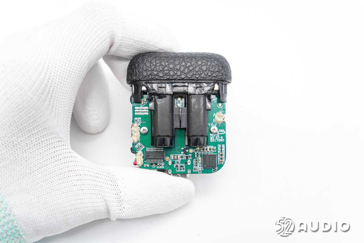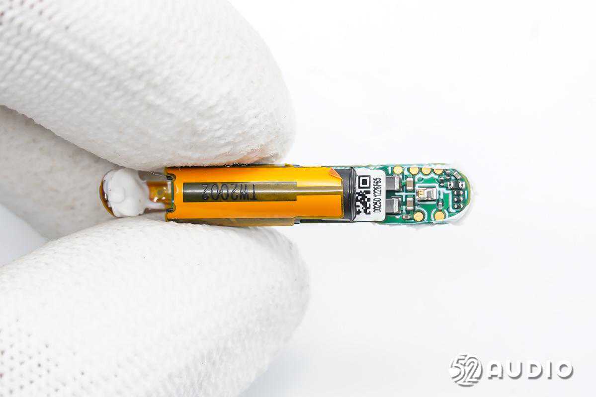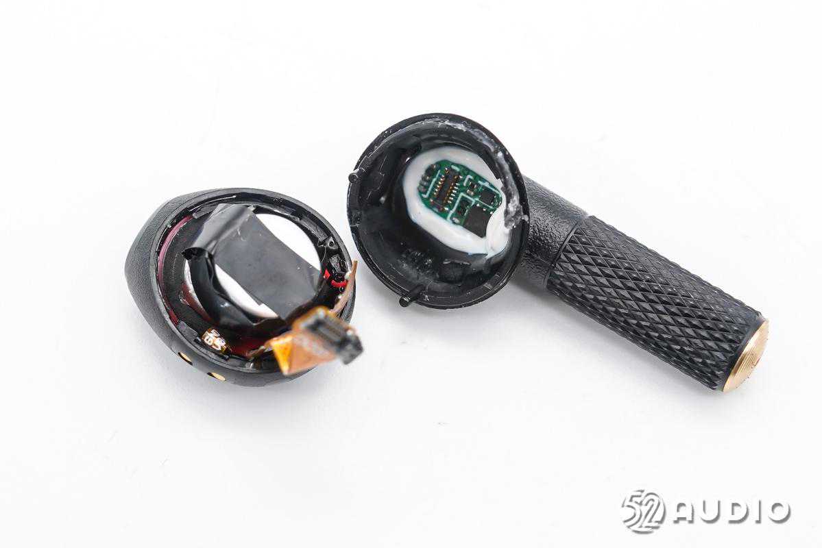 前腔内部结构一览,电池单元固定在扬声器背部,有黑色胶带包裹。