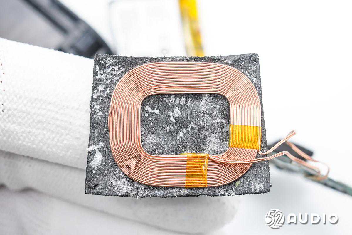 无线充电接收线圈特写,设置在隔磁屏蔽贴纸上。