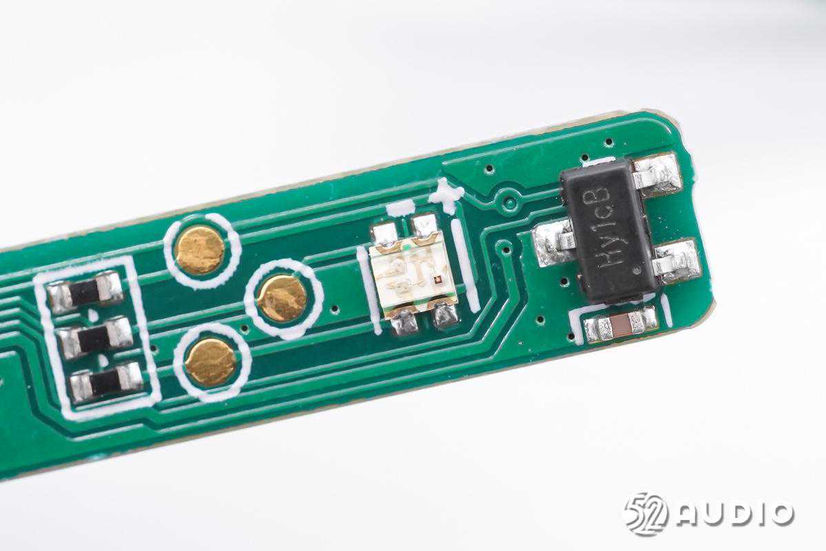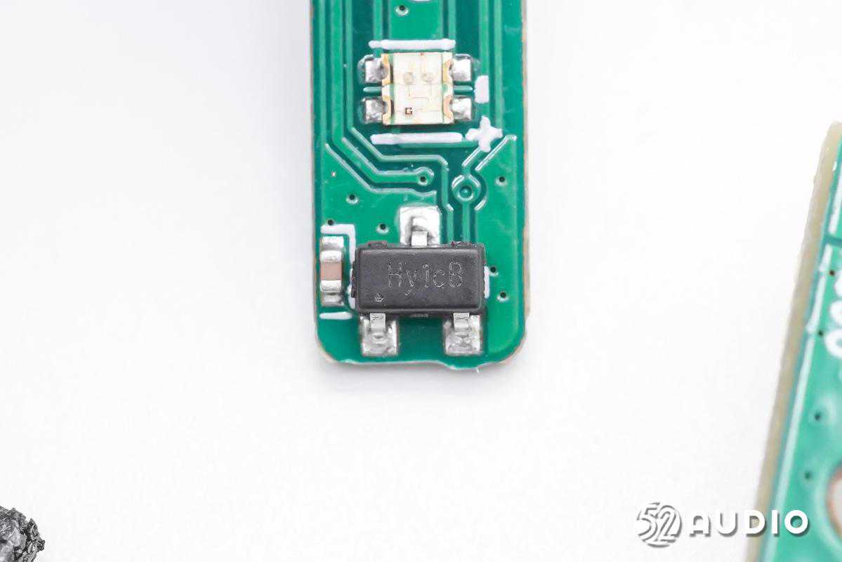 丝印Hy1cB的霍尔元件特写,用于感知充电盒盖开关时的磁场变化,进而通知充电盒MCU和耳机与已连接设备配对或断开连接。