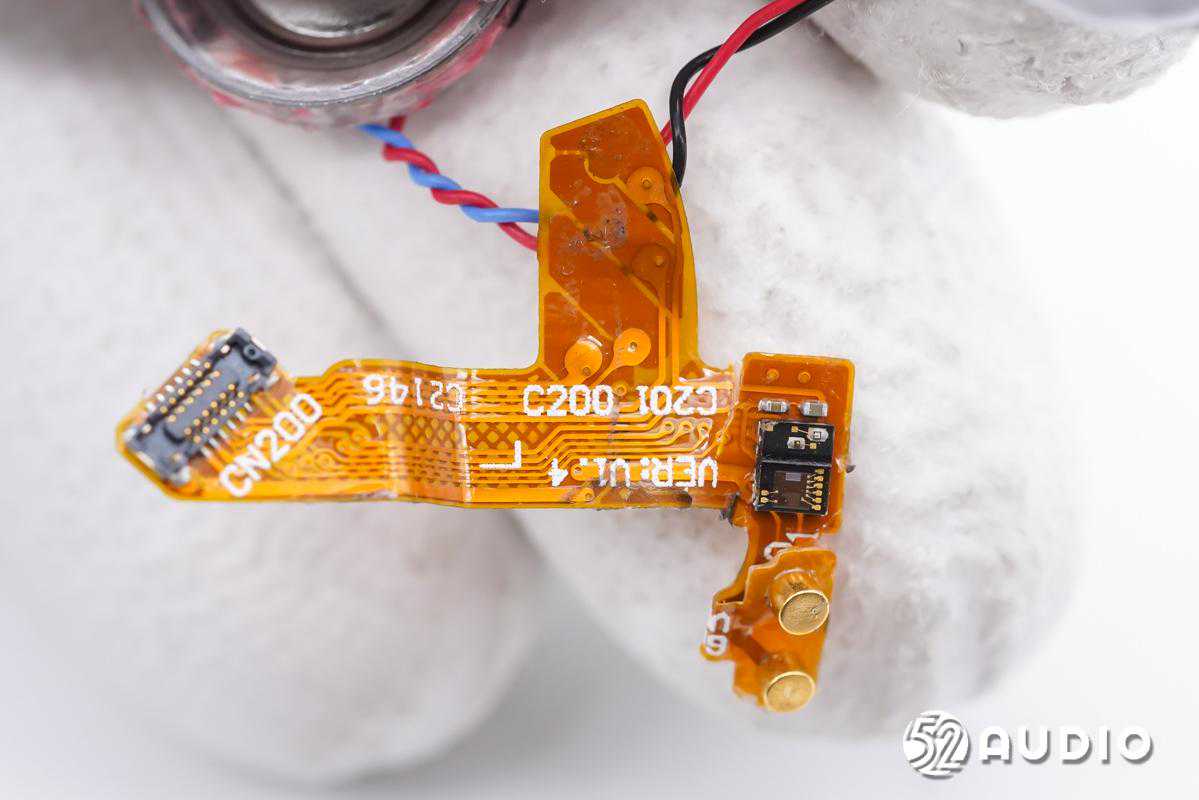 取出电池前腔内部结构一览,电池和扬声器导线分别焊接在排线上,排线一端设置充电触点和光学传感器,固定在腔体壁上。