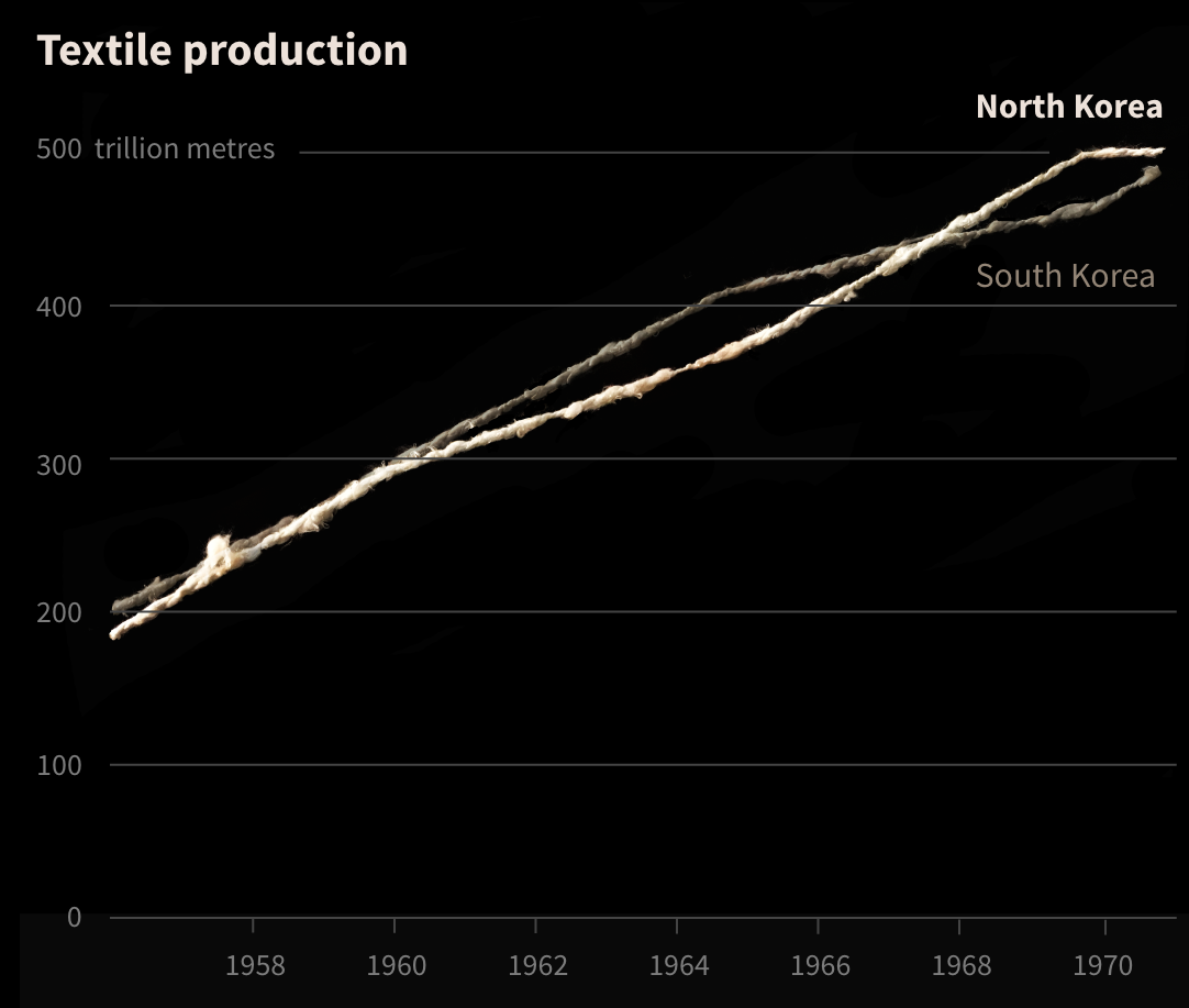 而在纺织品的年产量上,朝鲜也在1967年反超韩国,考虑其人口只是韩国的一半,人均产量更是高达南方的两倍。