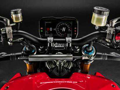 出色的电控是杜卡迪车型的一大特点,街霸V4也不例外,骑行模式、动力模式、弯道ABSEVO、DTCEVO(牵引力控制)、DWCEVO(车轮控制)、EBCEVO(发动机制动力控制)等旗舰级配置一应俱全,在骑行硬件配置上DPL(弹射起步)、DQS(双向快速换挡系统)也是其标配。