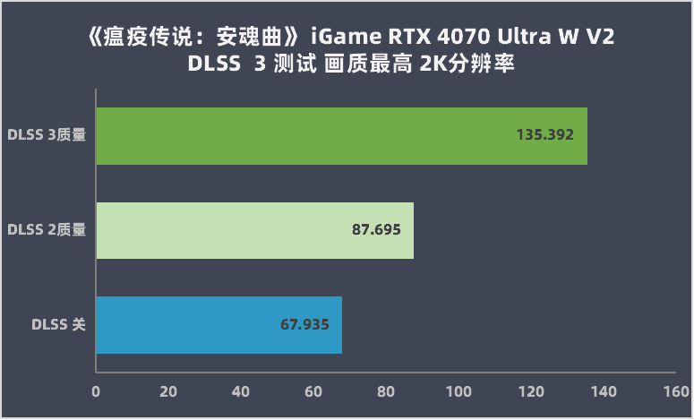 iGameGeForceRTX4070UltraWV2在2K分辨率且不开启DLSS2时,就已经能满足68帧畅玩了。如果开启DLSS2质量档,就能达到平均87帧,如果开启DLSS3插帧后,帧数更是会暴涨到平均135帧,满足2K高刷显示器的需求。