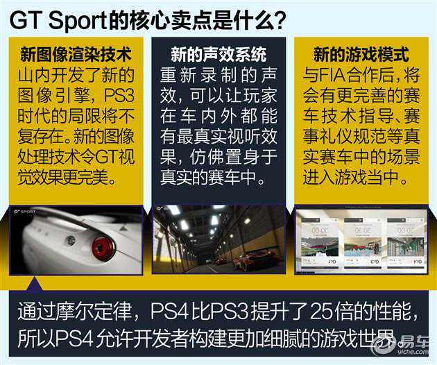 GTSport有什么新变化?从名字上可以看出,GT系列将更好的贯彻“真实的赛车”,Sport代表着作品会更加围绕着赛事展开。新作品中会有140辆重新制作的“超精细SuperPremiumModels”车辆模型,也就是说虽然车辆数目少了,但是与GT5和6相比,车辆的精细度会更高。