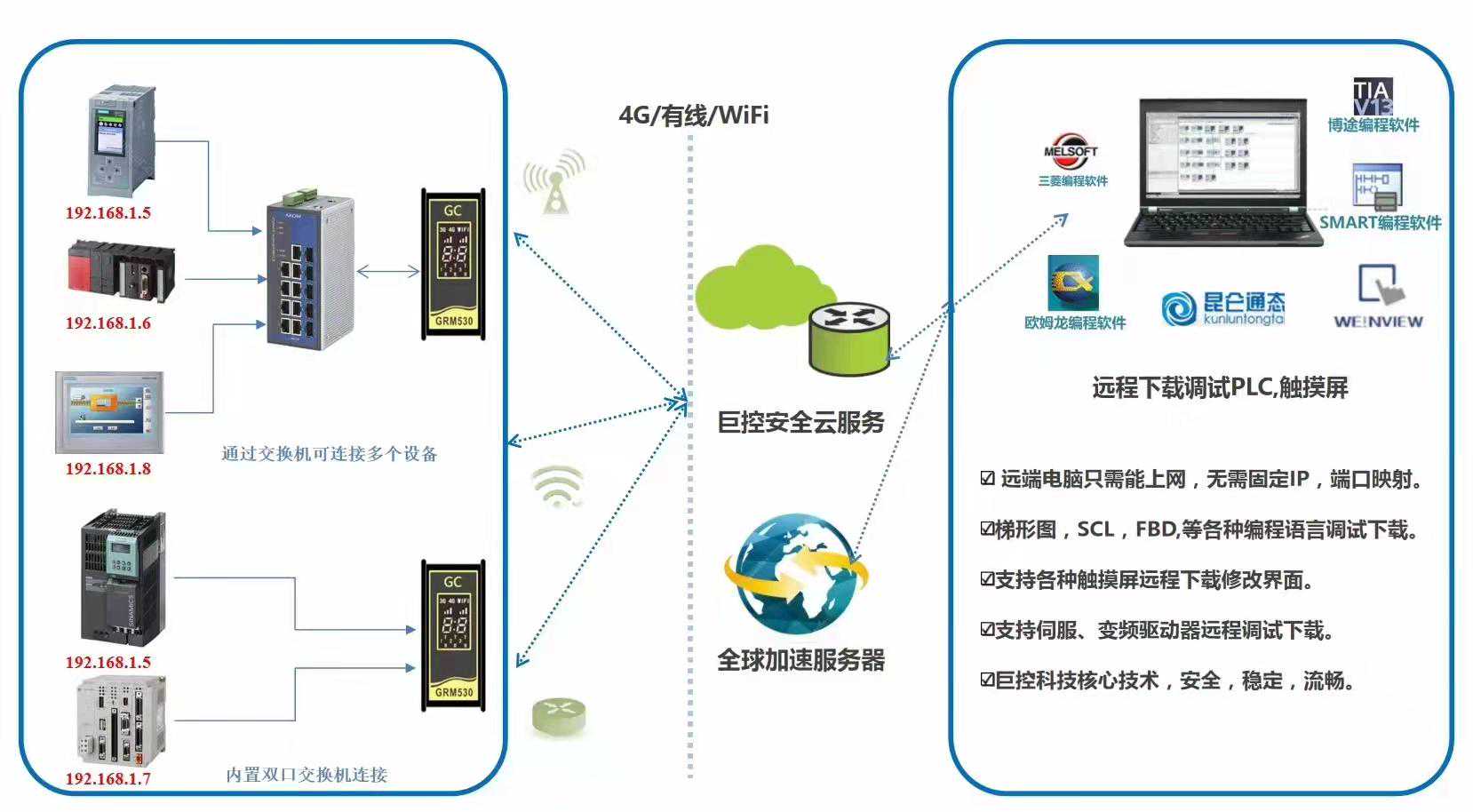 物联网时代,在疫情影响下,实现设备高效联网,从而达到全周期的远程运维尤为重要。中国国内的设备制造商客户除了满足国内需求,也早已经顺利“出海”,实现了全球的销售和服务部署。利用巨控GRM532/533YW-CWX的部署安装,可以打造客户自己的远程运行维护平台,与国内外用户现场建立全周期连接,实现远程安装调试和诊断,为客户提供精准及时的服务,支持客户设备快速投产和稳定运行,同时大幅降低客户的服务预算,并有效规避疫情感染风险。