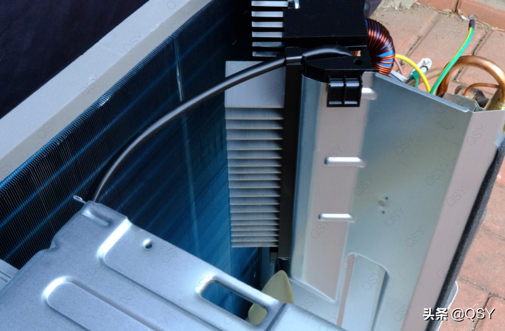 拆开米家自然风2匹外机上盖,可以看到是双排冷凝器,竖置电控板