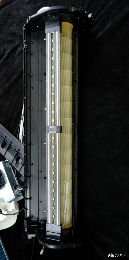 拆下米家自然风内机外壳、电控盒,剩下的主体部分,包括了蒸发器、电机、贯流风扇和电辅热等。