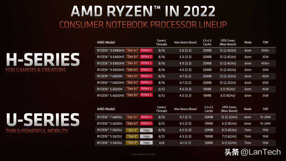 整个Ryzen6000系列可以分为H系列和U系列两大分支,而其中Ryzen96900HX是其中的旗舰产品: