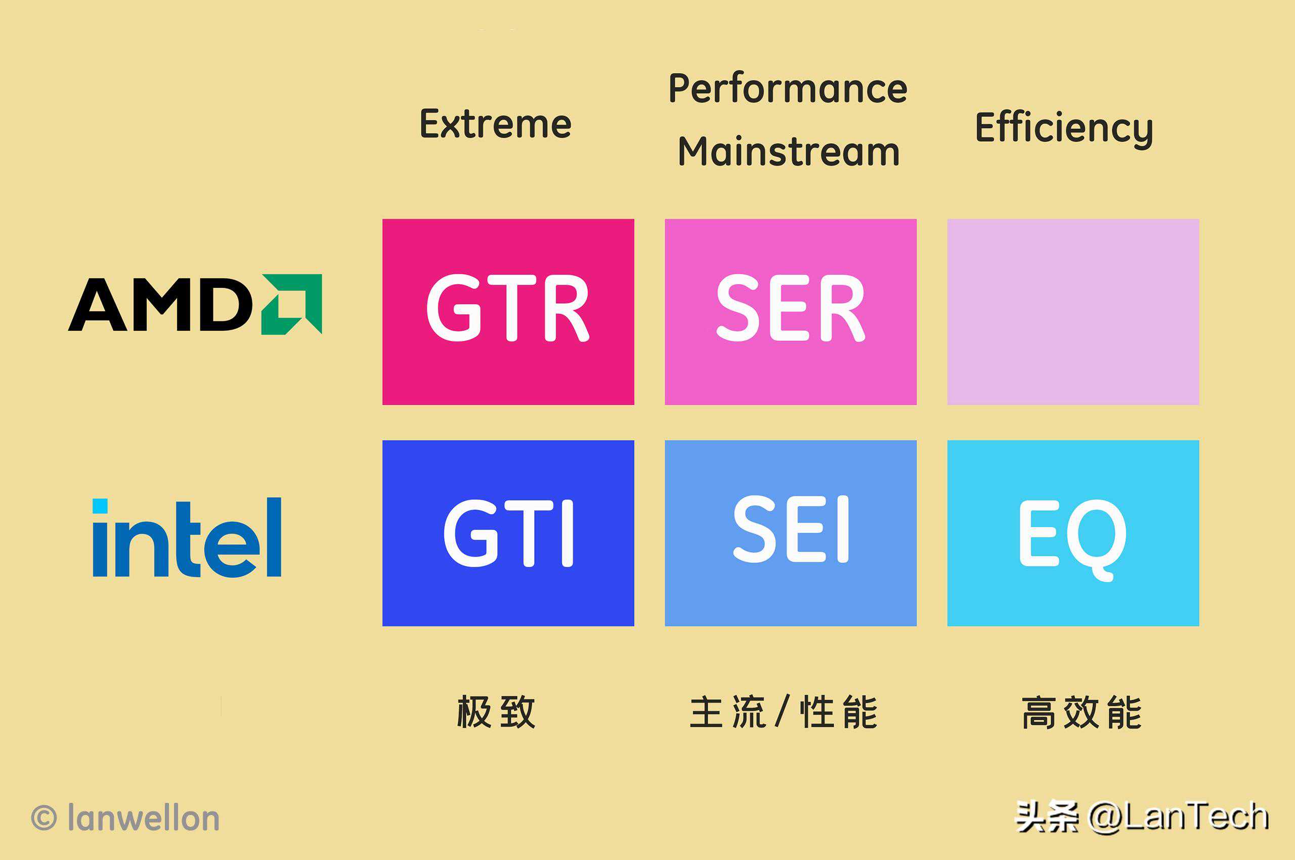 如笔者绘制的下面的这张矩阵图所示,零刻(Beelink)的迷你电脑按照性能分级与处理器厂商的不同,可以分为几个系列。而其中GTR系列是性能最极致的产品线,因而这款产品选用Ryzen96900HX作为处理器也就不奇怪了: