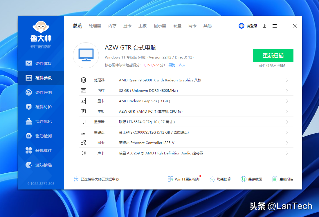 零刻GTR6高性能迷你电脑在鲁大师内的配置情况如下图所示: