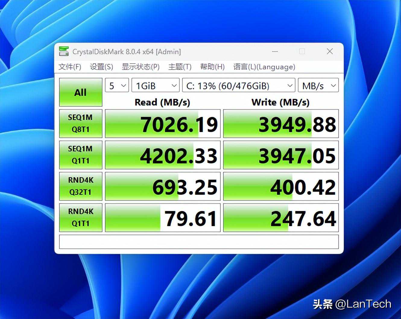 使用CDM的跑分结果如下,顺序读取超过7GB/s,这款SSD的速度可以说是相当给力了: