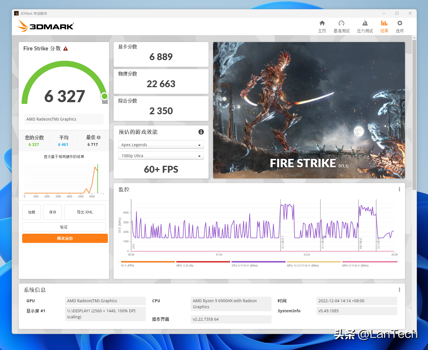 这里使用3DMarkFireStrike进行测试,跑分来到了6260分。预估《APEX英雄》这样的游戏,可以以60帧以上的帧率流畅运行: