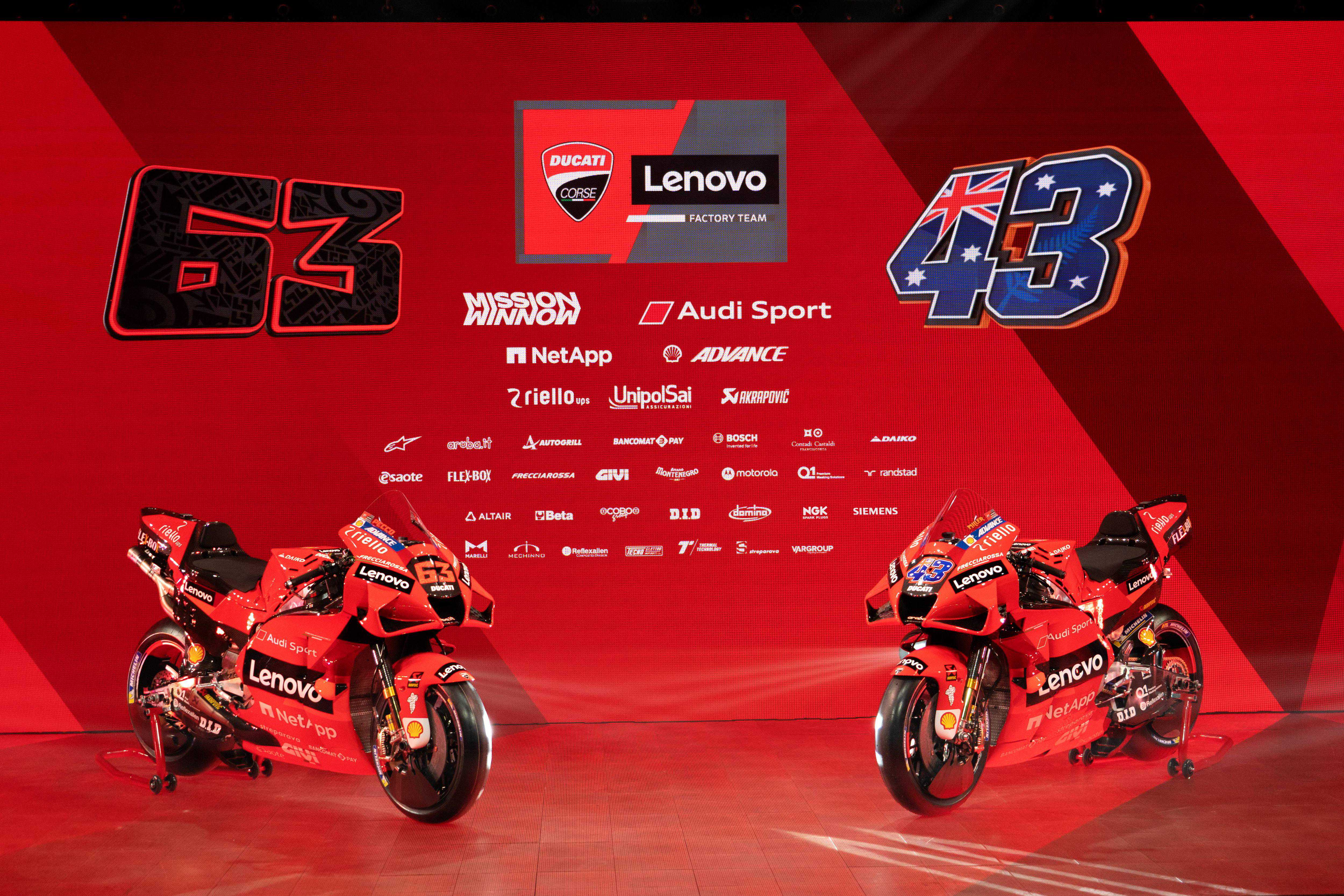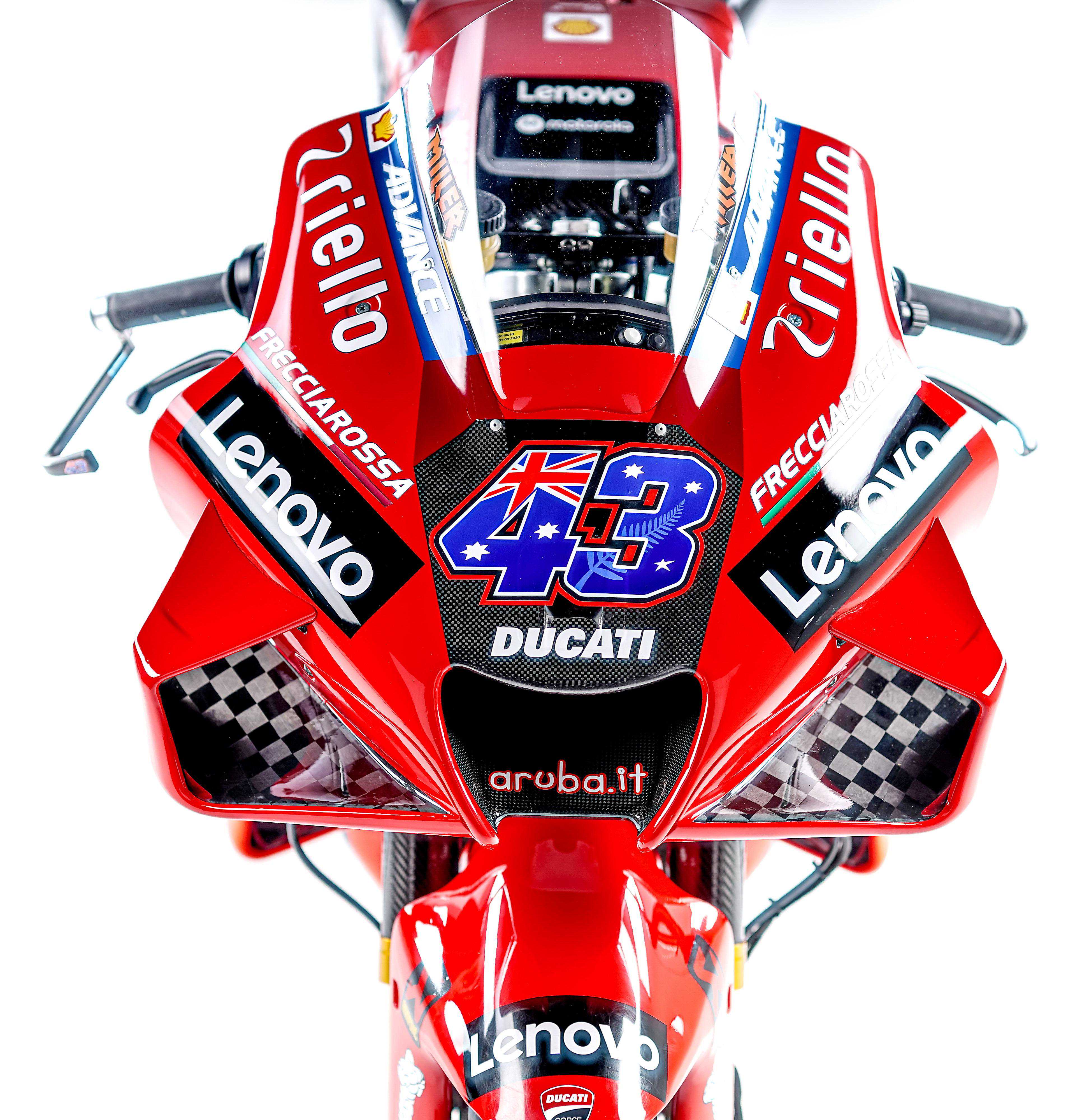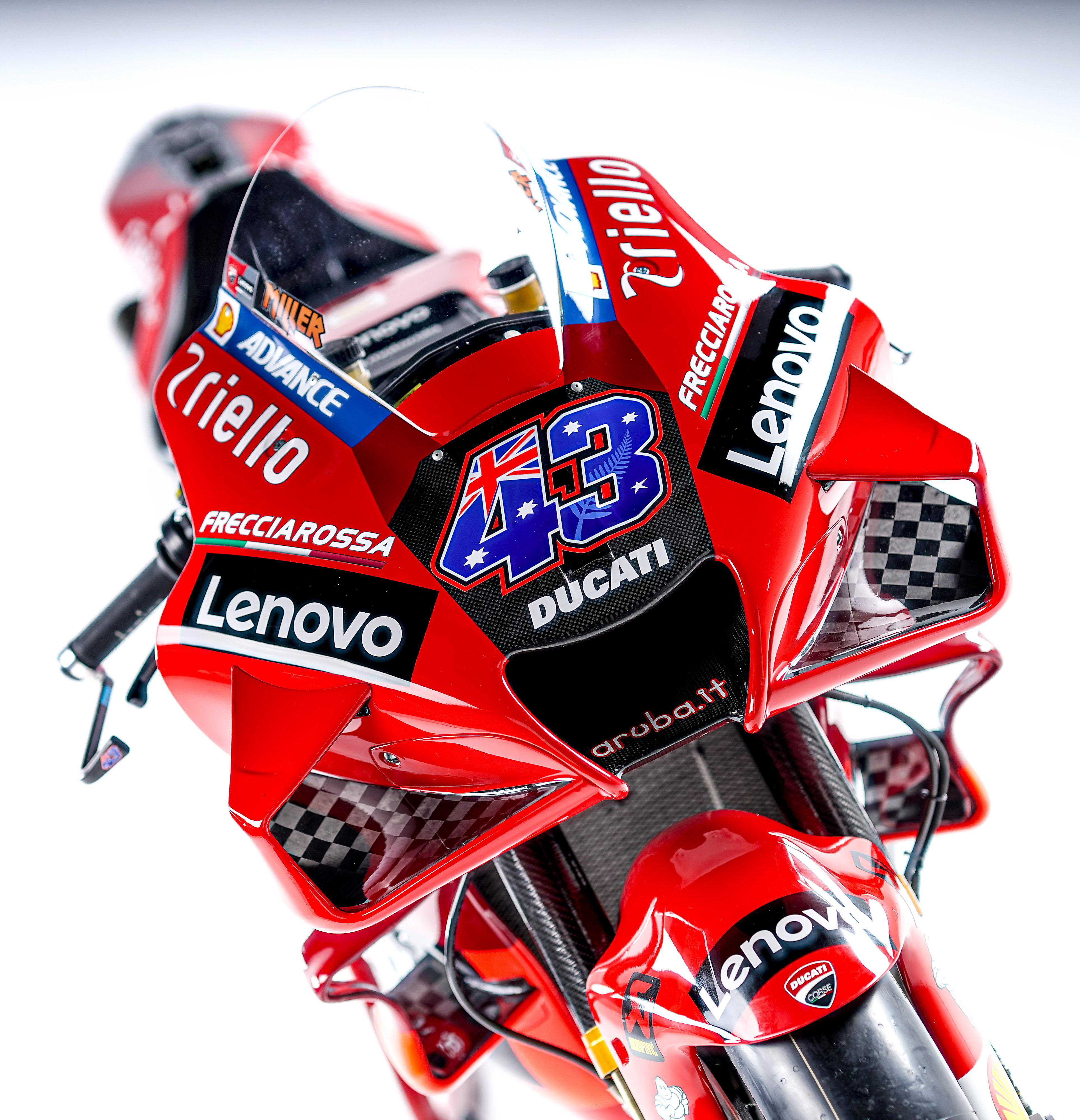 MotoGP新的2021赛季,杜卡迪工厂车队的车手组合,是去年已经发布的、全面年轻化的澳大利亚车手米勒(JackMiller,43号车)和意大利车手巴纳亚(PeccoBagnaia,63号车)。