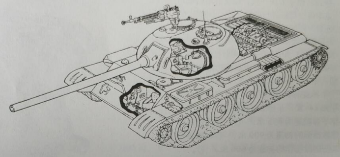 我们再将视线拉回,说说T-54坦克的整体特点。T-54坦克车组成员4人,分为车长,炮长,装填手,驾驶员。车辆内部可划分为驾驶室,战斗室,动力室三个。