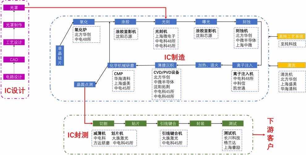 国内半导体设备制造商的关键业务链中,以中国半导体产业而言,在晶圆代工,封装测试设备上目前大部分依赖进口。