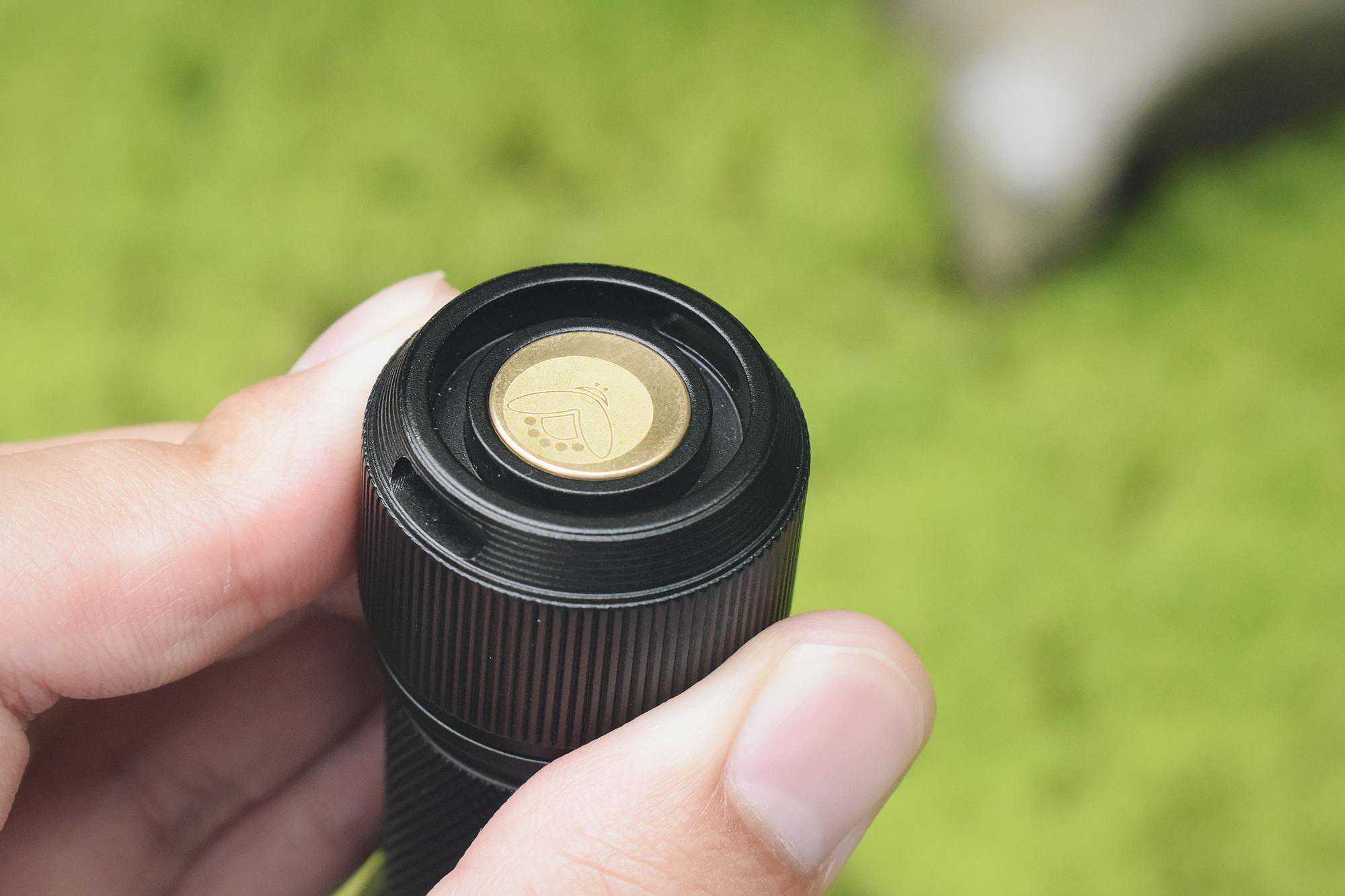 ES2只有唯一尾按,其为电子微动开关,按下时清脆利落,其操作逻辑也很简单。双击+按住为单双头选择输出,四击锁定、五击开启摩尔斯电码,长按为萤火虫模式。而需要在无级和阶段调光间切换时也只需要在待机状态下同样三连击就可以了。开关为金色,其上的小虫标志很有趣。其键位与尾盖持平,倒立无压力。
