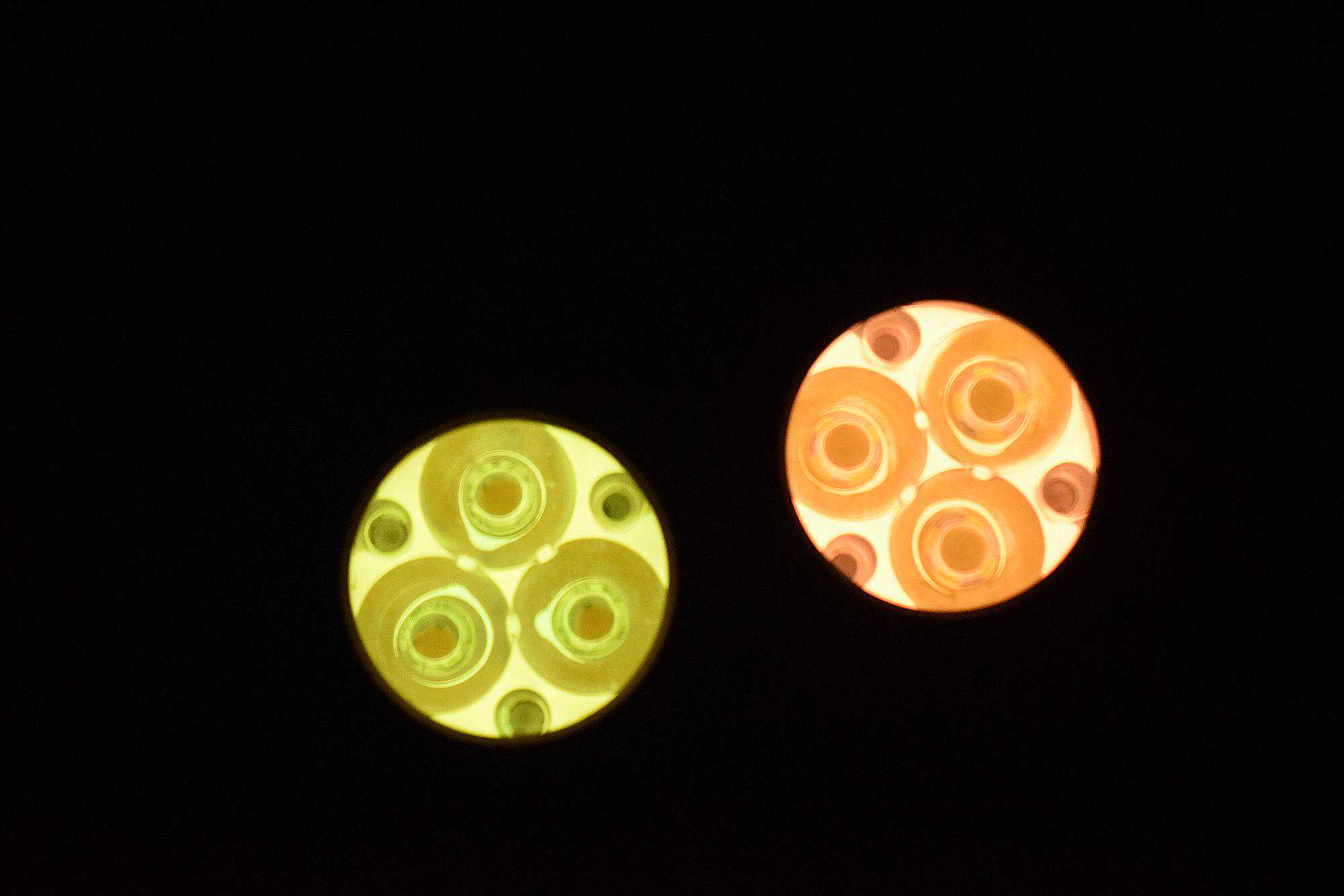 将灯珠拆卸下来后,可以看到双筒头内部均为铜柱导电,在更换灯头时也需要注意对齐拧紧。耐家的三眼灯头都带有夜光片,其颜色为随机。