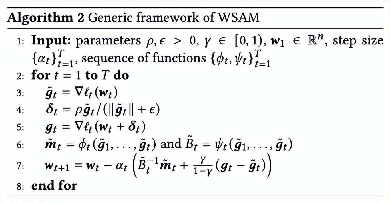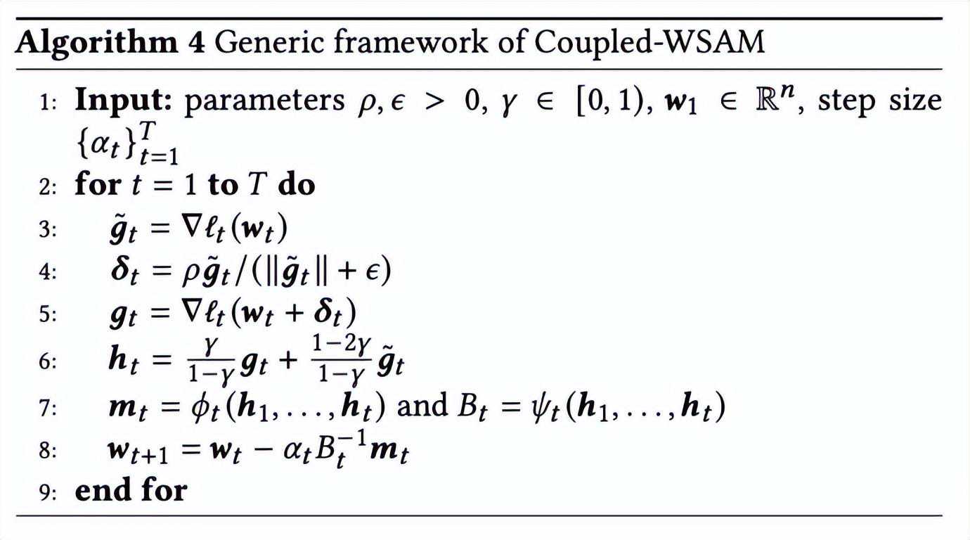 包含不同基础优化器的WSAM的通用框架可以通过选择不同的和来实现,见Algorithm2。例如,当和时,我们得到基础优化器为SGD的WSAM,见Algorithm3。在此,我们采用了一种“权重解耦”技术,即平坦度项不是与基础优化器集成用于计算梯度和更新权重,而是独立计算(Algorithm2第7行的最后一项)。这样,正则化的效果只反映了当前步骤的平坦度,而没有额外的信息。为了进行比较,Algorithm4给出了没有“权重解耦”(称为Coupled-WSAM)的WSAM。例如,如果基础优化器是SGDM,则Coupled-WSAM的正则化项是平坦度的指数移动平均值。如实验章节所示,“权重解耦”可以在大多数情况下改善泛化表现。