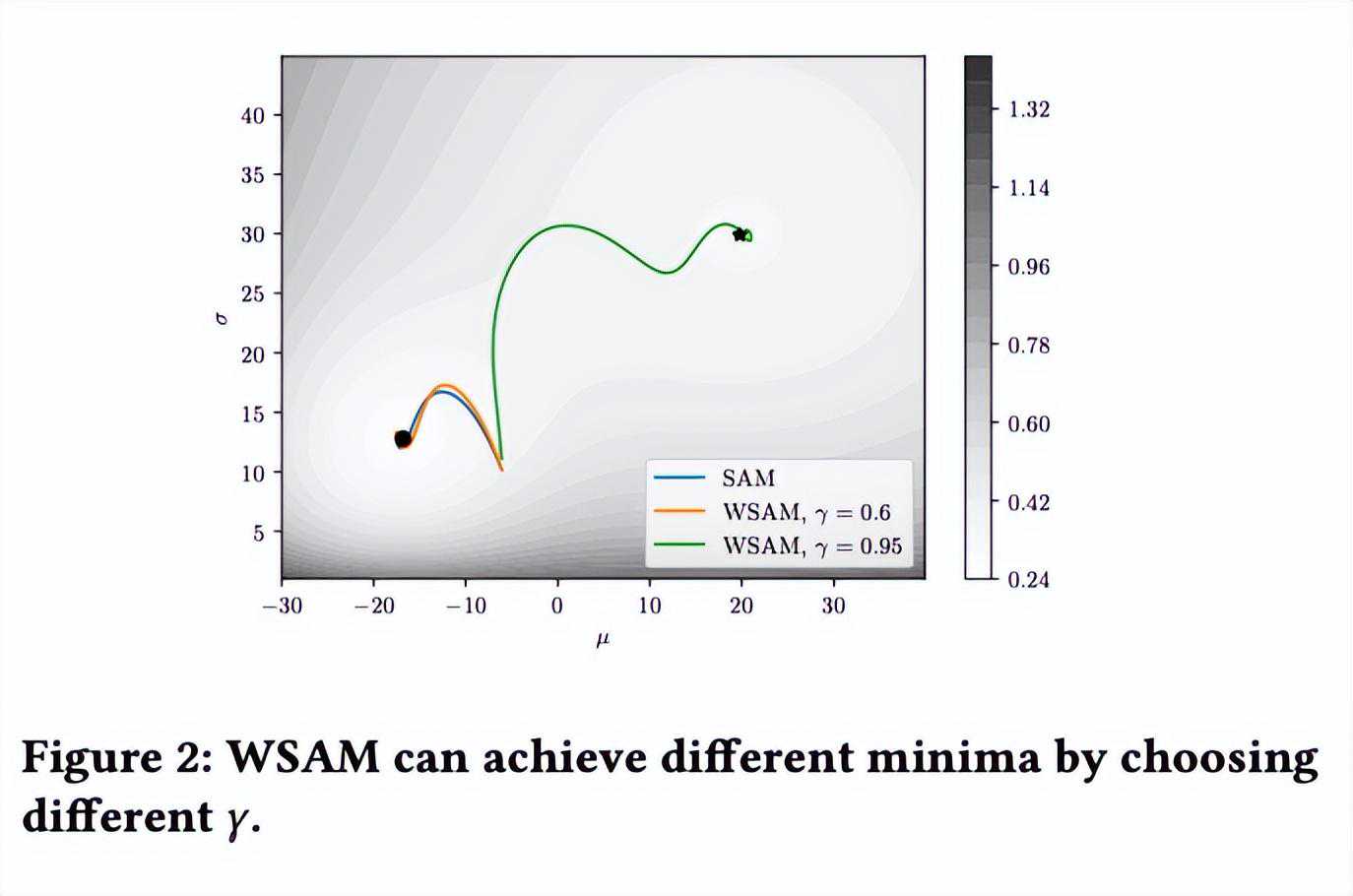 为了更好地说明WSAM中γ的效果和优势,我们设置了一个二维简单示例。如所示,损失函数在左下角有一个相对不平坦的极值点(位置:(-16.8,12.8),损失值:0.28),在右上角有一个平坦的极值点(位置:(19.8,29.9),损失值:0.36)。损失函数定义为: