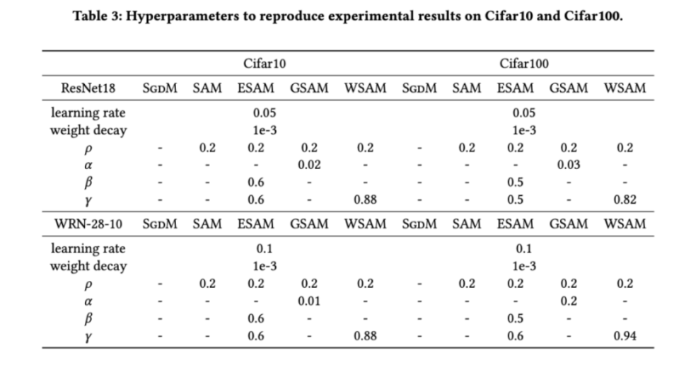 对于两种模型,我们使用联合网格搜索确定基础优化器的学习率和权重衰减系数,并将它们保持不变用于接下来的SAM类优化器实验。学习率和权重衰减系数的搜索范围分别为{0.05,0.1}和{1e-4,5e-4,1e-3}。由于所有SAM类优化器都有一个超参数(邻域大小),我们接下来在SAM优化器上搜索最佳的并将相同的值用于其他SAM类优化器。的搜索范围为{0.01,0.02,0.05,0.1,0.2,0.5}。最后,我们对其他SAM类优化器各自独有的超参进行搜索,搜索范围来自各自原始文章的推荐范围。对于GSAM[2],我们在{0.01,0.02,0.03,0.1,0.2,0.3}范围内搜索。对于ESAM[3],我们在{0.4,0.5,0.6}范围内搜索,在{0.4,0.5,0.6}范围内搜索,在{0.4,0.5,0.6}范围内搜索。对于WSAM,我们在{0.5,0.6,0.7,0.8,0.82,0.84,0.86,0.88,0.9,0.92,0.94,0.96}范围内搜索。我们使用不同的随机种子重复实验5次,计算了平均误差和标准差。我们在单卡NVIDIAA100GPU上进行实验。每个模型的优化器超参总结在中。