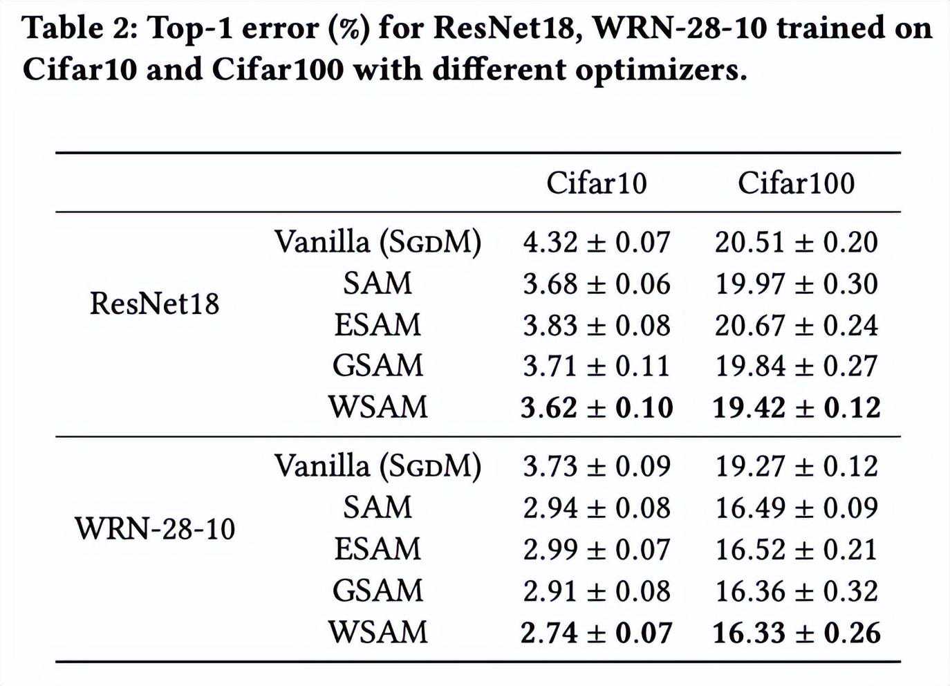 给出了在不同优化器下,ResNet18、WRN-28-10在Cifar10和Cifar100上测试集的top-1错误率。相比基础优化器,SAM类优化器显著提升了效果,同时,WSAM又显著优于其他SAM类优化器。