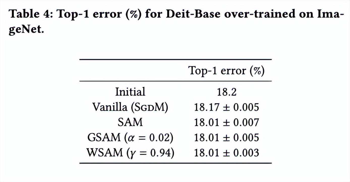 模型的初始top-1错误率为18.2%,在进行了三个额外的epoch之后,错误率如所示。我们没有发现三个SAM-like优化器之间有明显的差异,但它们都优于基础优化器,表明它们可以找到更平坦的极值点并具有更好的泛化能力。
