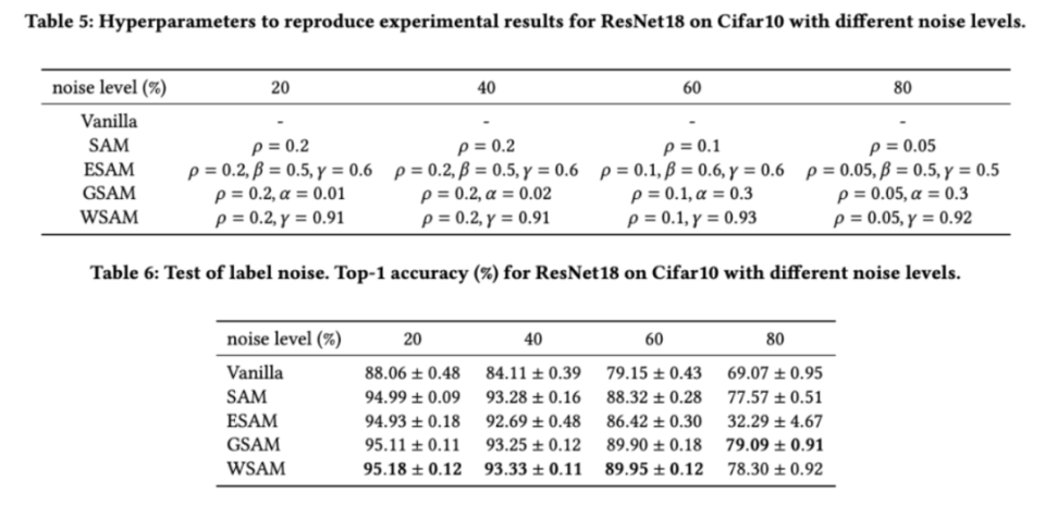 如先前的研究[1,4,5]所示,SAM类优化器在训练集存在标签噪声时表现出良好的鲁棒性。在这里,我们将WSAM的鲁棒性与SAM、ESAM和GSAM进行了比较。我们在Cifar10数据集上训练ResNet18200个epoch,并注入对称标签噪声,噪声水平为20%、40%、60%和80%。我们使用具有0.9动量的SGDM作为基础优化器,批大小为128,学习率为0.05,权重衰减系数为1e-3,并使用cosinescheduler衰减学习率。针对每个标签噪声水平,我们在{0.01,0.02,0.05,0.1,0.2,0.5}范围内对SAM进行网格搜索,确定通用的值。然后,我们单独搜索其他优化器特定的超参数,以找到最优泛化性能。我们在中列出了复现我们结果所需的超参数。我们在中给出了鲁棒性测试的结果,WSAM通常比SAM、ESAM和GSAM都具有更好的鲁棒性。