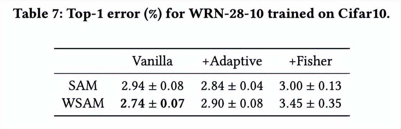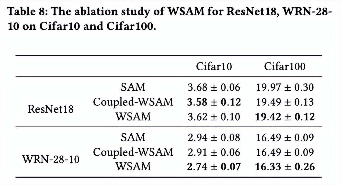 我们提出WSAM,将平坦度视为正则化项,并在不同任务之间给予不同的权重。我们提出一个“权重解耦”技术来处理更新公式中的正则化项,旨在精确反映当前步骤的平坦度。当基础优化器不是SGD时,如SGDM和Adam,WSAM在形式上与SAM有显著差异。消融实验表明,这种技术在大多数情况下可以提升效果。