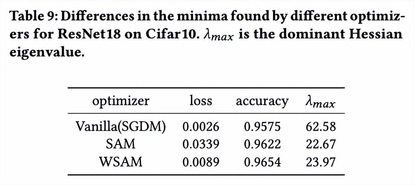 显示了SAM和WSAM优化器找到的极值点之间的差异。我们发现,vanilla优化器找到的极值点具有更小的损失值但更不平坦,而SAM找到的极值点具有更大的损失值但更平坦,从而改善了泛化性能。有趣的是,WSAM找到的极值点不仅损失值比SAM小得多,而且平坦度十分接近SAM。这表明,在寻找极值点的过程中,WSAM优先确保更小的损失值,同时尽量搜寻到更平坦的区域。