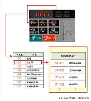仅需选择给水泵、传送带、供气排气讽扇等用途,即可自动设定适宜的参数。缩短了试运行的时间。