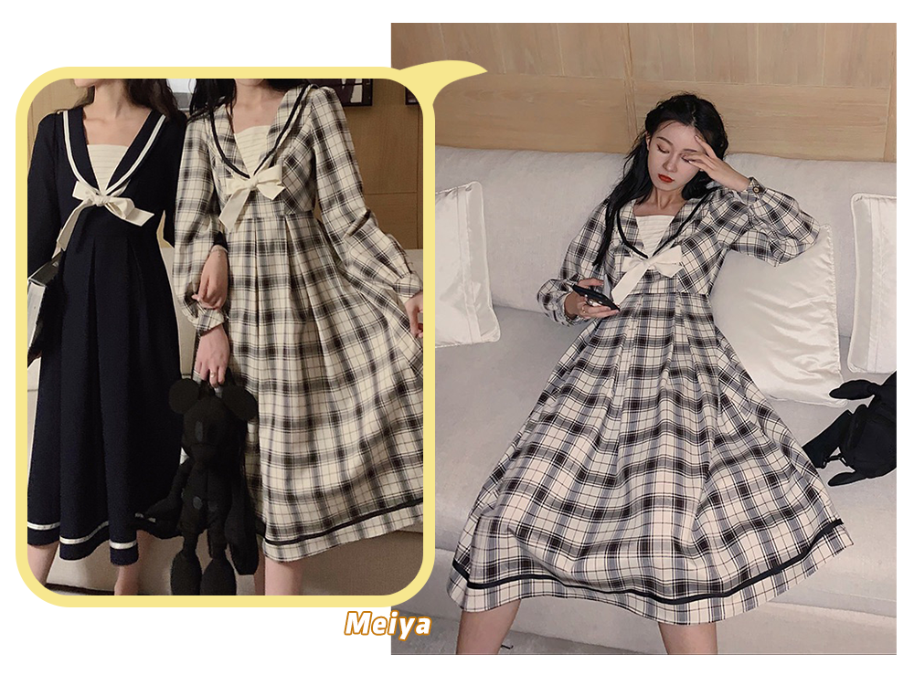 而且呢芽芽觉得娃娃领的连衣裙不但单穿很适合,也很适合叠穿起到1+12的效果,比如和背带裙一起穿,是不是很特别。