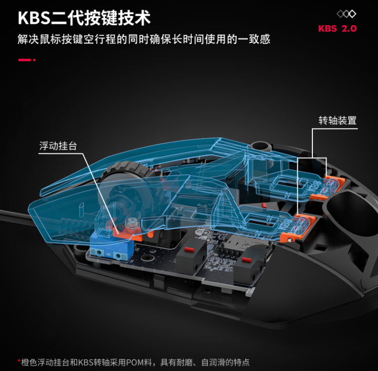 A970表面采用了类肤处理,亲和力十足。而作为鼠标最常用的左右键,这里就涉及到达尔优的黑科技—KBS二代按键系统。