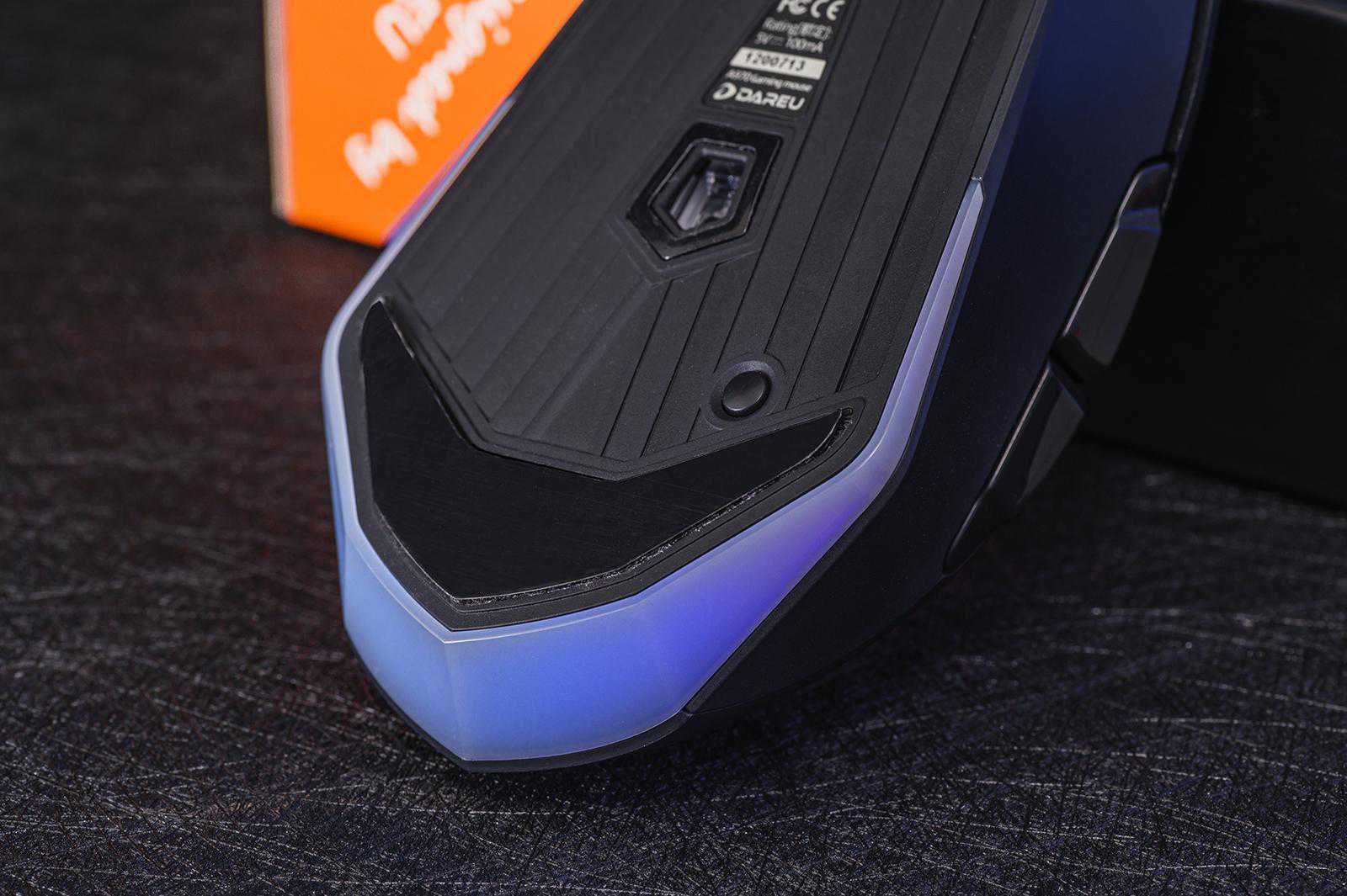 底部采用了线条视觉冲击感很强的设计,配合鼠标整体棱角分明,挺硬派帅气。马蹄形的底部背光也很炫,而且底部还有RGB背光模式的物理调节按钮,非常方便。