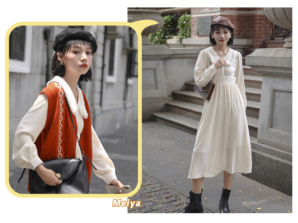 而且呢芽芽觉得娃娃领的连衣裙不但单穿很适合,也很适合叠穿起到1+12的效果,比如和背带裙一起穿,是不是很特别。