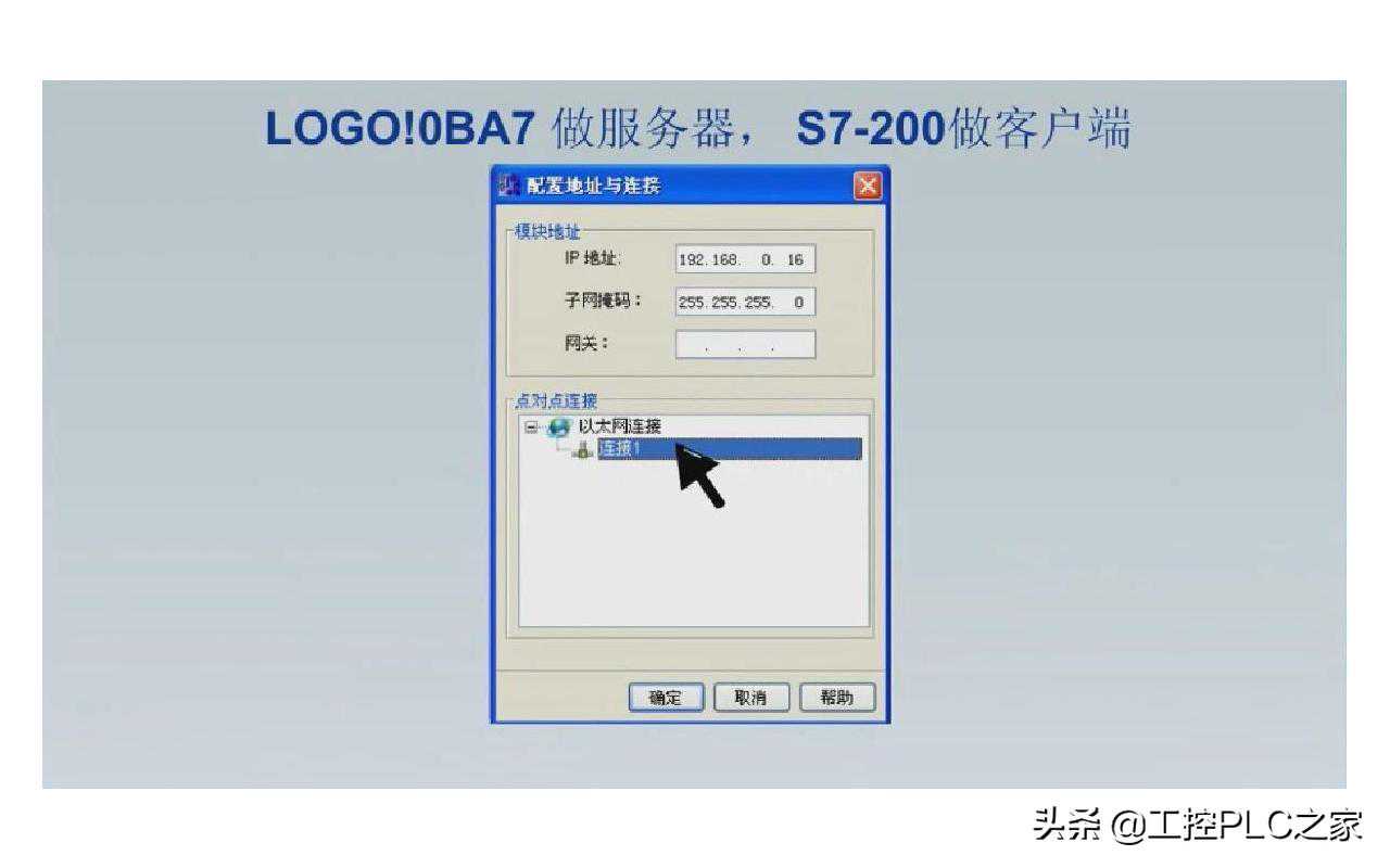 然后我们打开STEP7MicroWIN软件,先设置PG/PC接口。首先仍然是使用S7-200的以太网向导,设置步骤同上篇文章一样,在此不再详细说明,但是要注意在配置连接对话框中要选择此为客户机连接,在远程属性(服务器)中写入,为此连接指定服务器的IP地址处填入LOGO!0BA7的IP地址192.168.0.16。