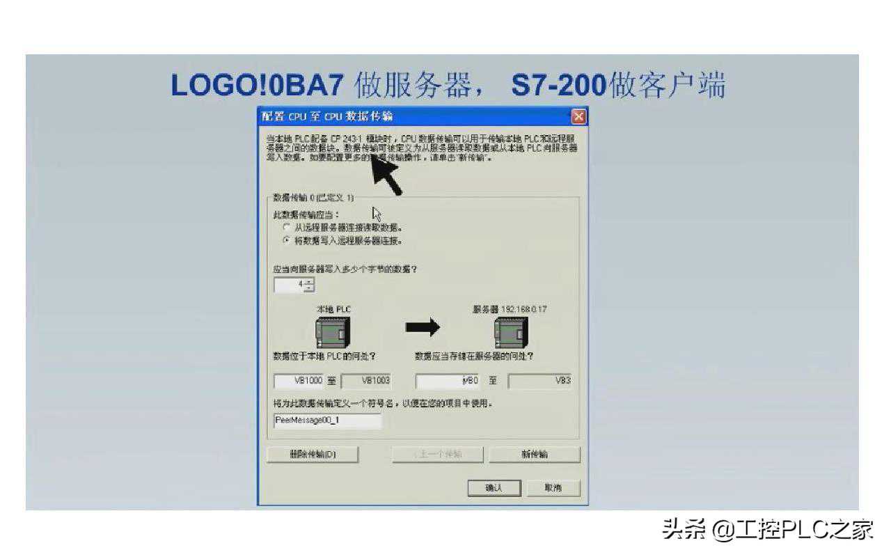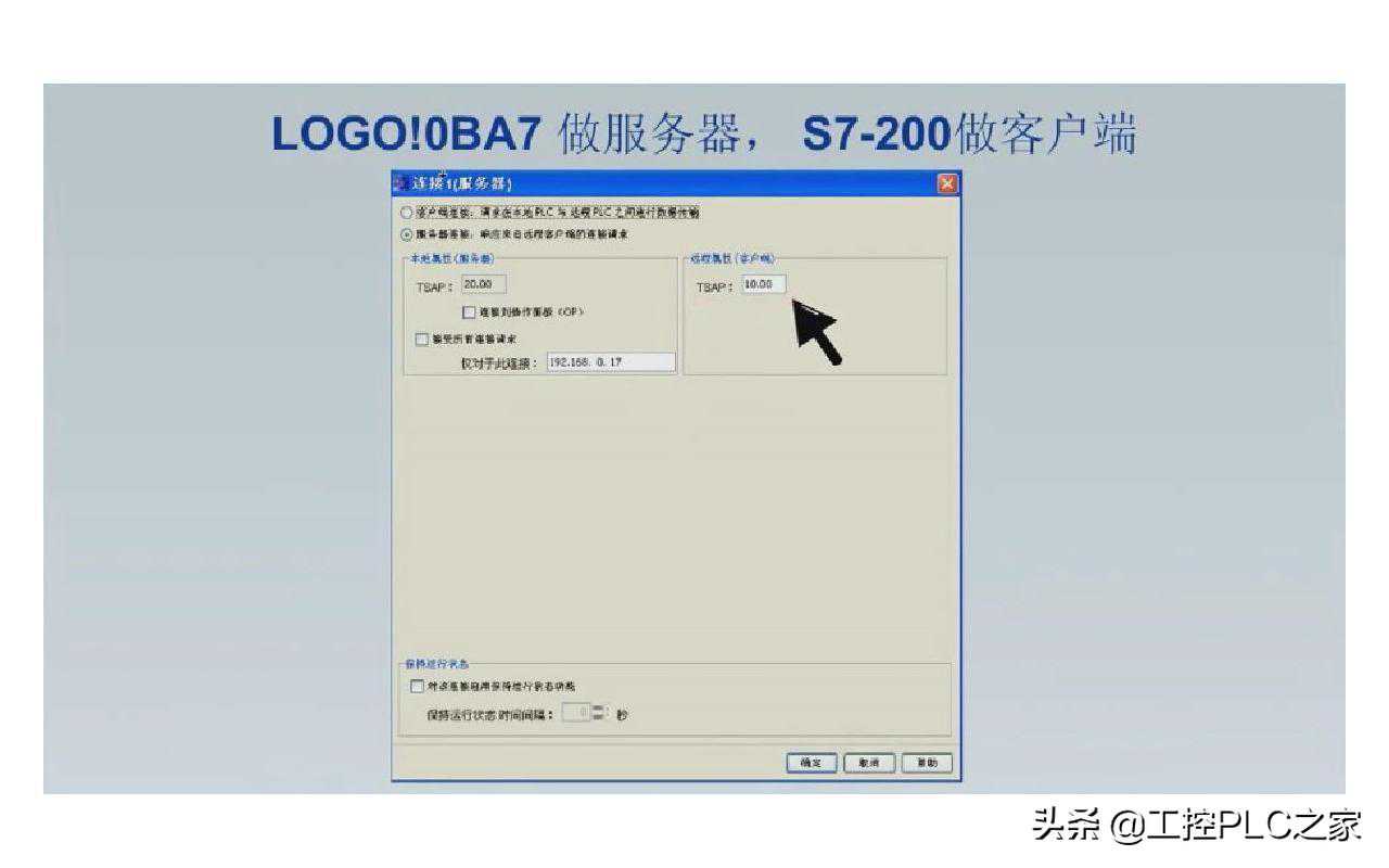 添加新的连接在连接1属性对话框中如下图所示进行设置。选择服务器连接,在本地属性(服务器)的仅对于此连接中输入S7-200的IP地址192.168.0.17,在远程属性(客户端)的TSAP中输入10.0......
