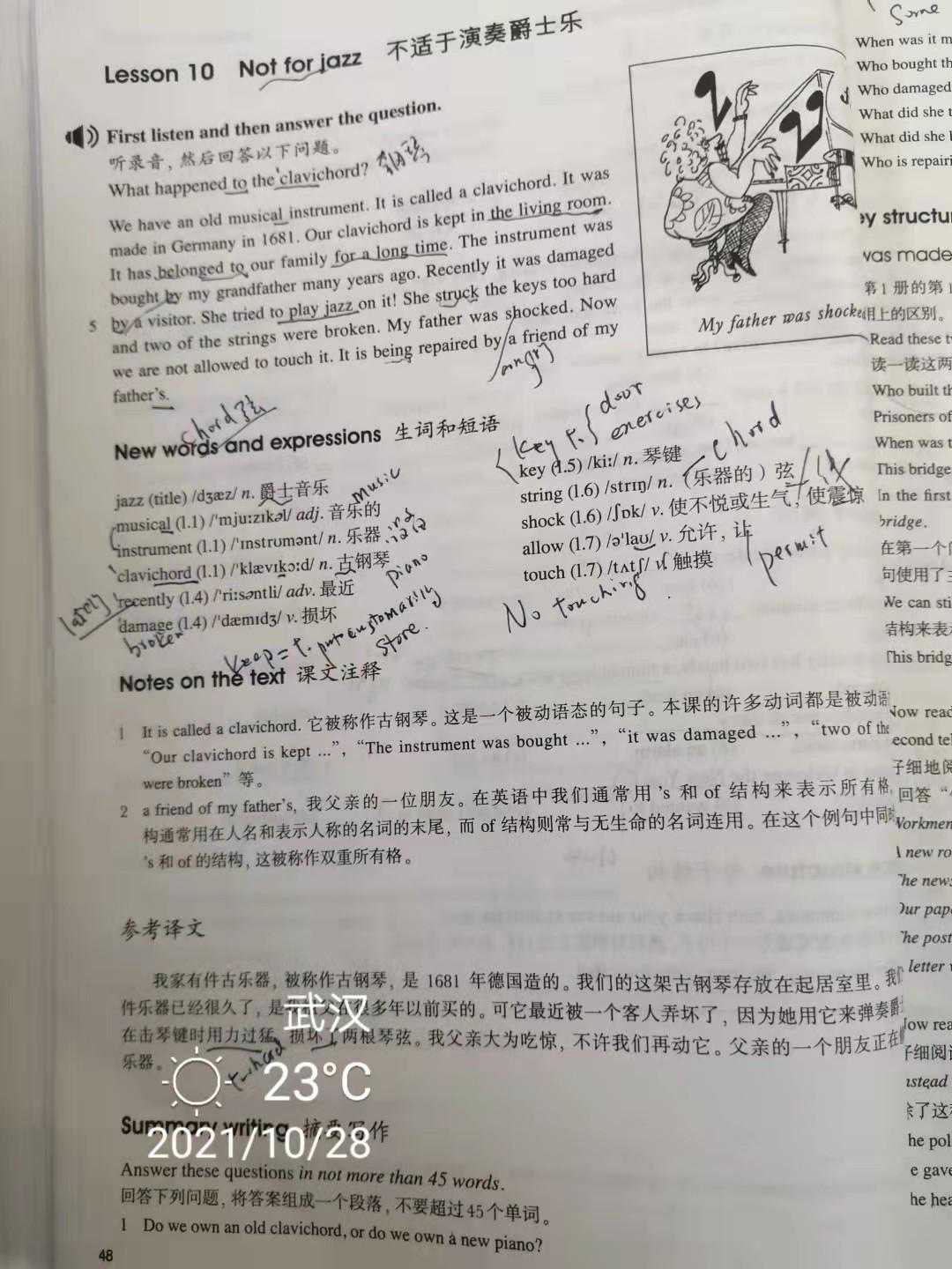 英语单词“Clavichord”中的“Chord”是弦乐器的一部分,在乐器中如出现“chord”,就说明这种乐器是弦乐。课文中的clavichord最早出现在十七世纪,在现在看来它已经是一个古董了。古董非常容易损坏。因为爵士乐有很强的节奏感,不适合在弦乐器上演奏。爵士乐起源于上世纪二十年代的美国波士顿,而美国的新奥尔良是爵士乐的故乡。爵士乐的一个特点是即兴演奏。