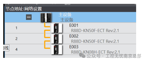 打开SysmacStudio,新建NJ工程。在EtherCAT网络配置里添加3台R88D-KN50F-ECT伺服,节点号分别为1、2、3。