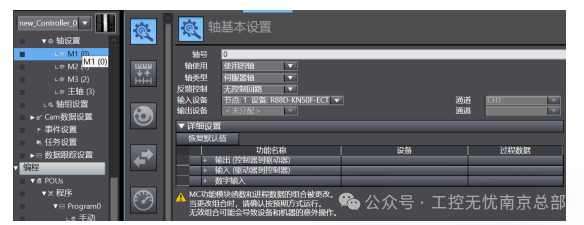 在轴设置里添加3个轴变量,重命名为M1、M2、M3。轴类型设置为伺服轴,输出设备分别选择三台R88D-KN50F-ECT伺服,其他轴参数使用默认设置。