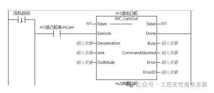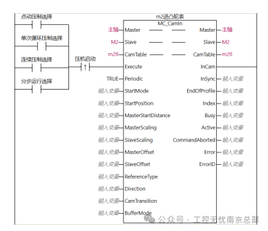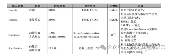电子凸轮耦合时,要定义以下参数:主轴master、从轴slave、凸轮表camtable、上升沿启动execute、重复模式periodic(初始值为FALSE/0不重复,此处改为TRUE/1)。