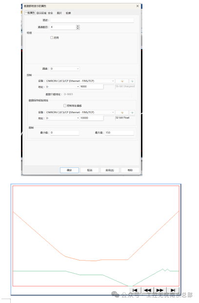 在威纶通里运用“群组显示曲线”,D9000为控制地址,当设数值为1时:绘制折线图,当设数值为2时:清除折线图,当设数值为3时:先清除折线图,再绘制折线图。D9001为数据个数地址,设置通道欲显示数据群组的数量,最多可达1024个点。D10000为数据保存起始地址。触摸屏在线模拟后,显示曲线图如下: